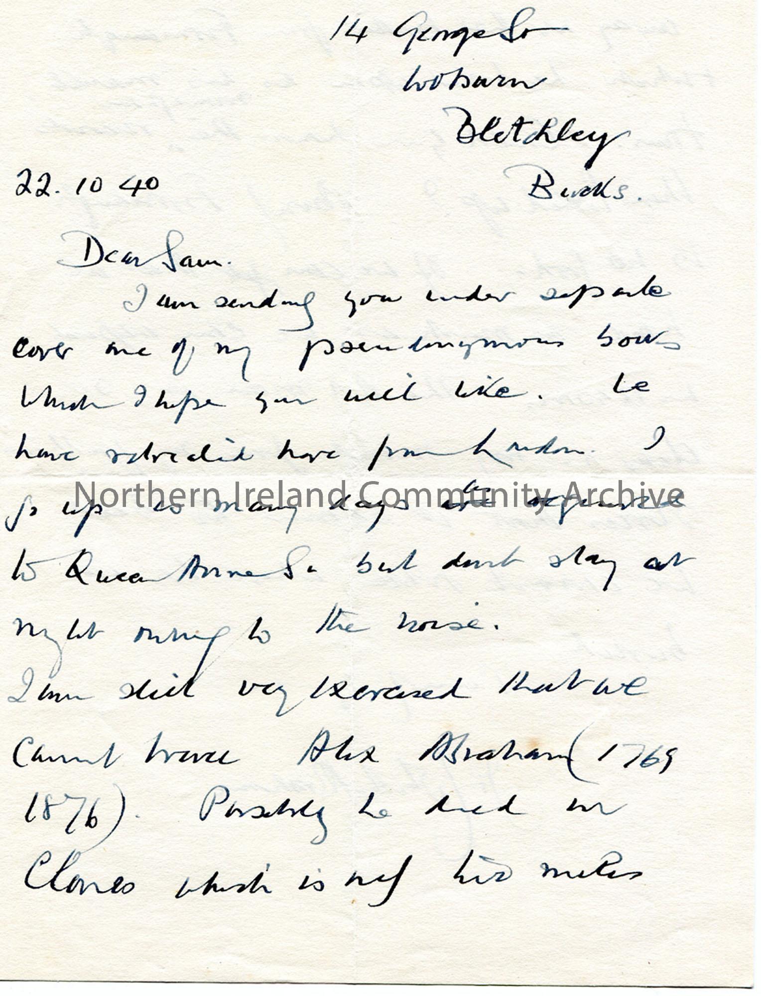 Handwritten letter (double sided) to Sam Henry. Re Sam's help in tracing the Abraham family tree. Sending Sam a book of poems separately. He does not stay at his Queen Anne Street address at night due to the noise [World War II]. They cannot trace Alex Abraham and asks Sam to look up records in Monaghan.