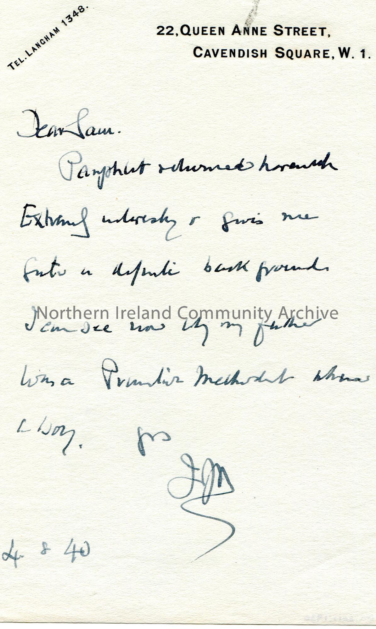 Handwritten letter to Sam Henry. Returns pamphlet and comments on it. He can see why his father was a Primitive Methodist.