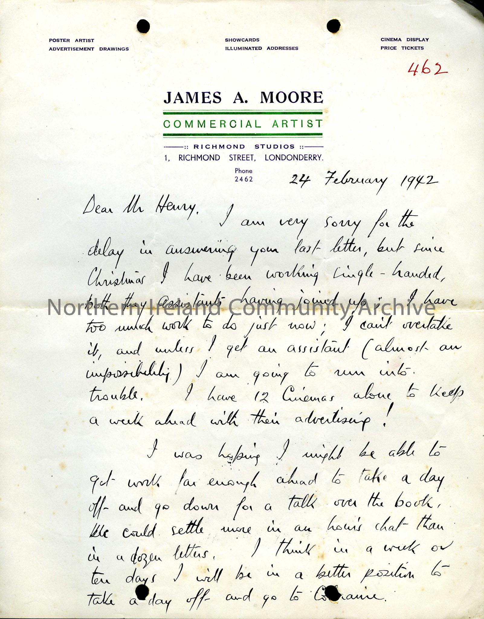 Letter from James Moore, commercial artist, about providing illustrations for a book by Sam Henry.