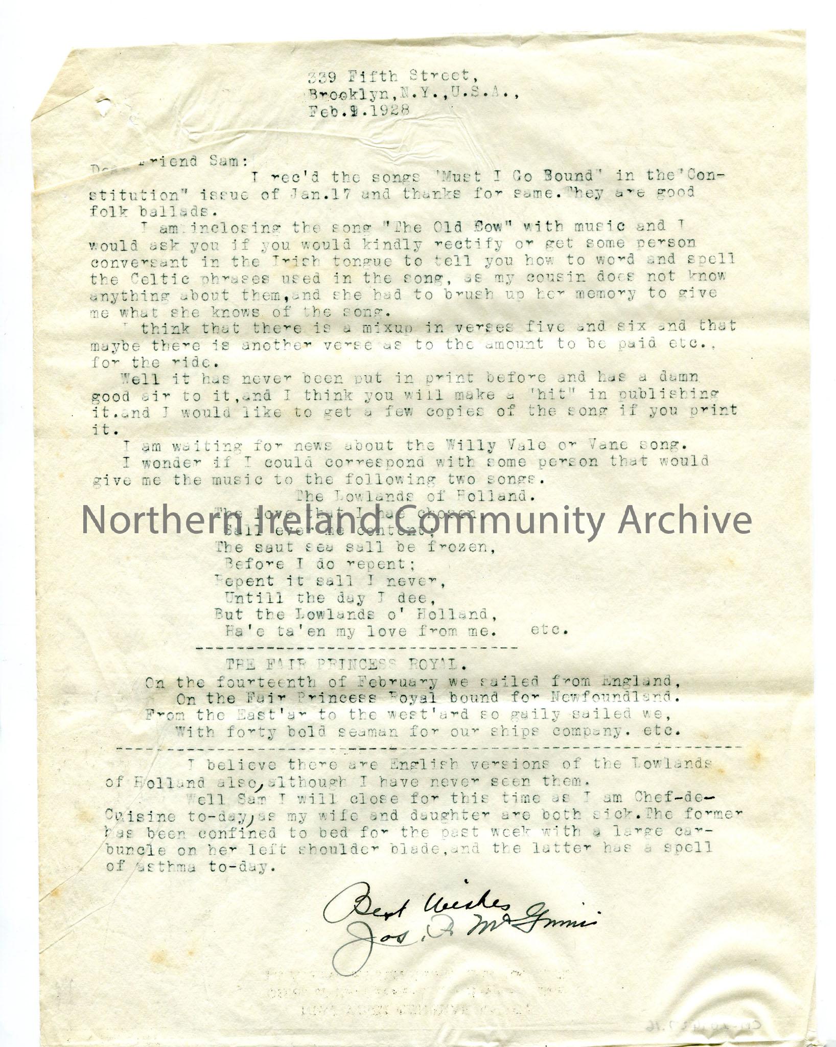 Letter from Joseph re songs. One of a bundle of documents pinned together, from Joseph McGinnis, who had a keen interest in songs sung by sailors.
