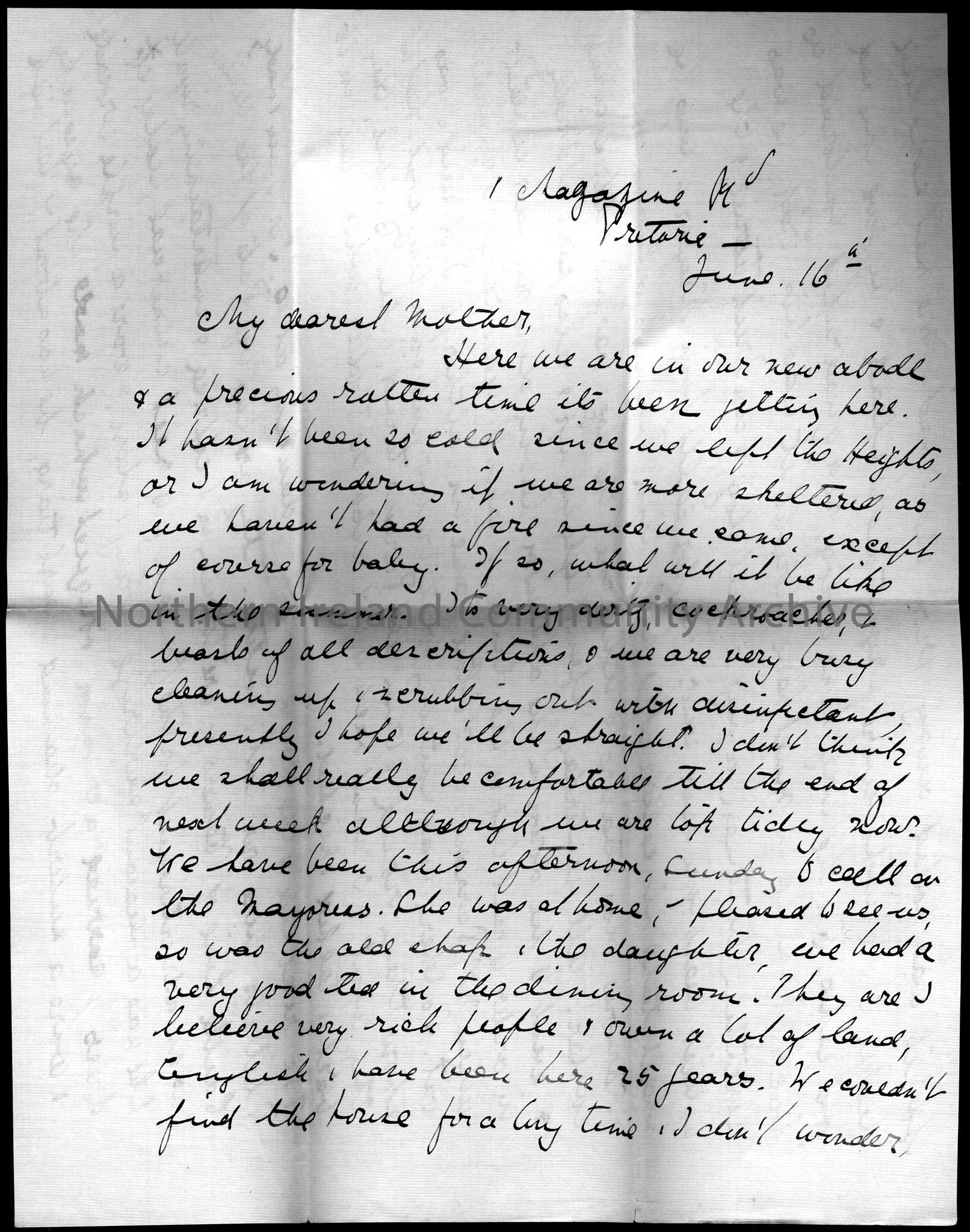 letter from Lady Dorothy Arter Hezlet to her mother from 1 Magazine Road, Pretoria, June 16th. Dorothy has recently moved to Magazine Road, Pretoria f…