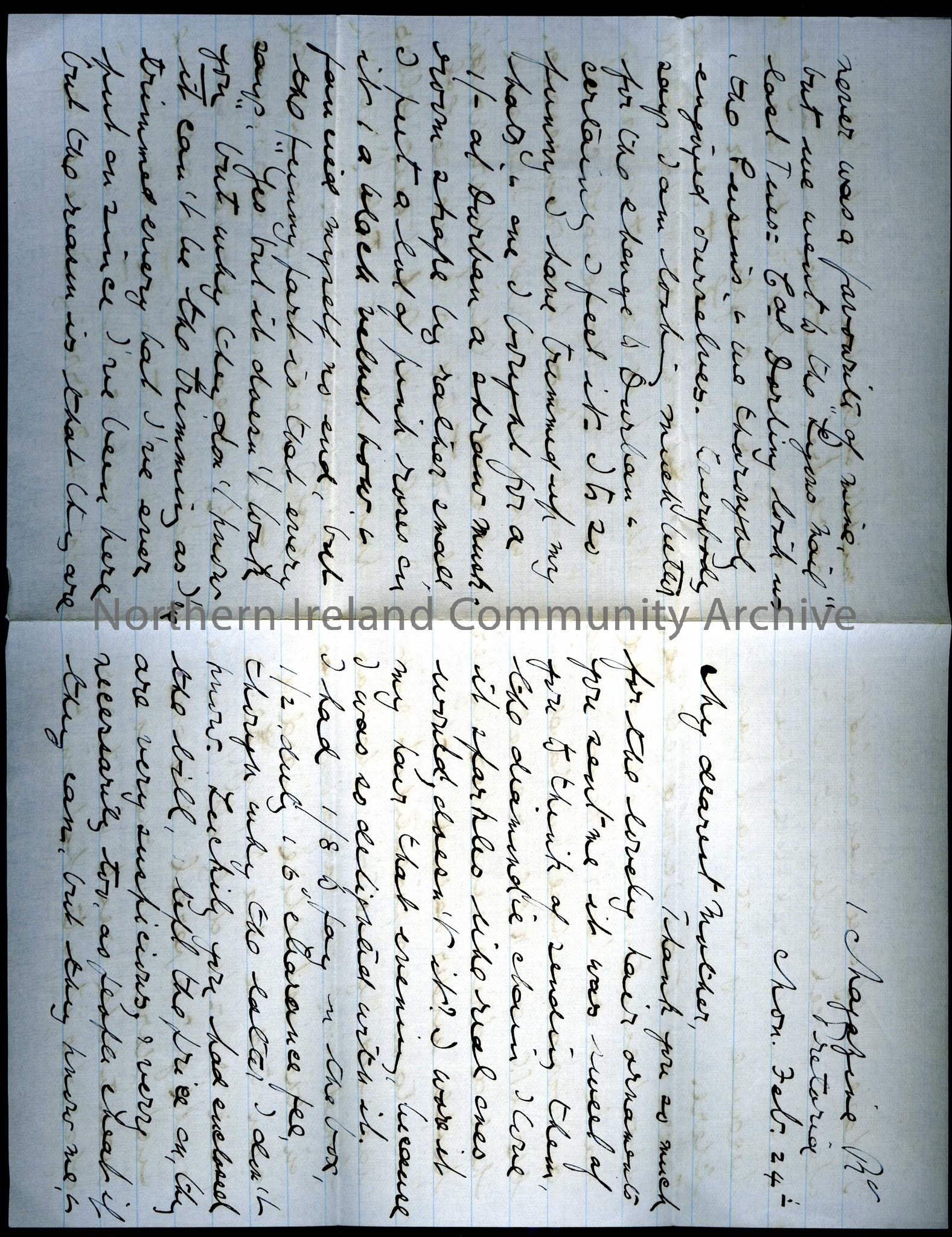 letter from Lady Dorothy Arter Hezlet to her mother from 1 Magazine Road Pretoria Mon Feb, 24th. Dorothy writes that her mother sent her jewellery. Sh…