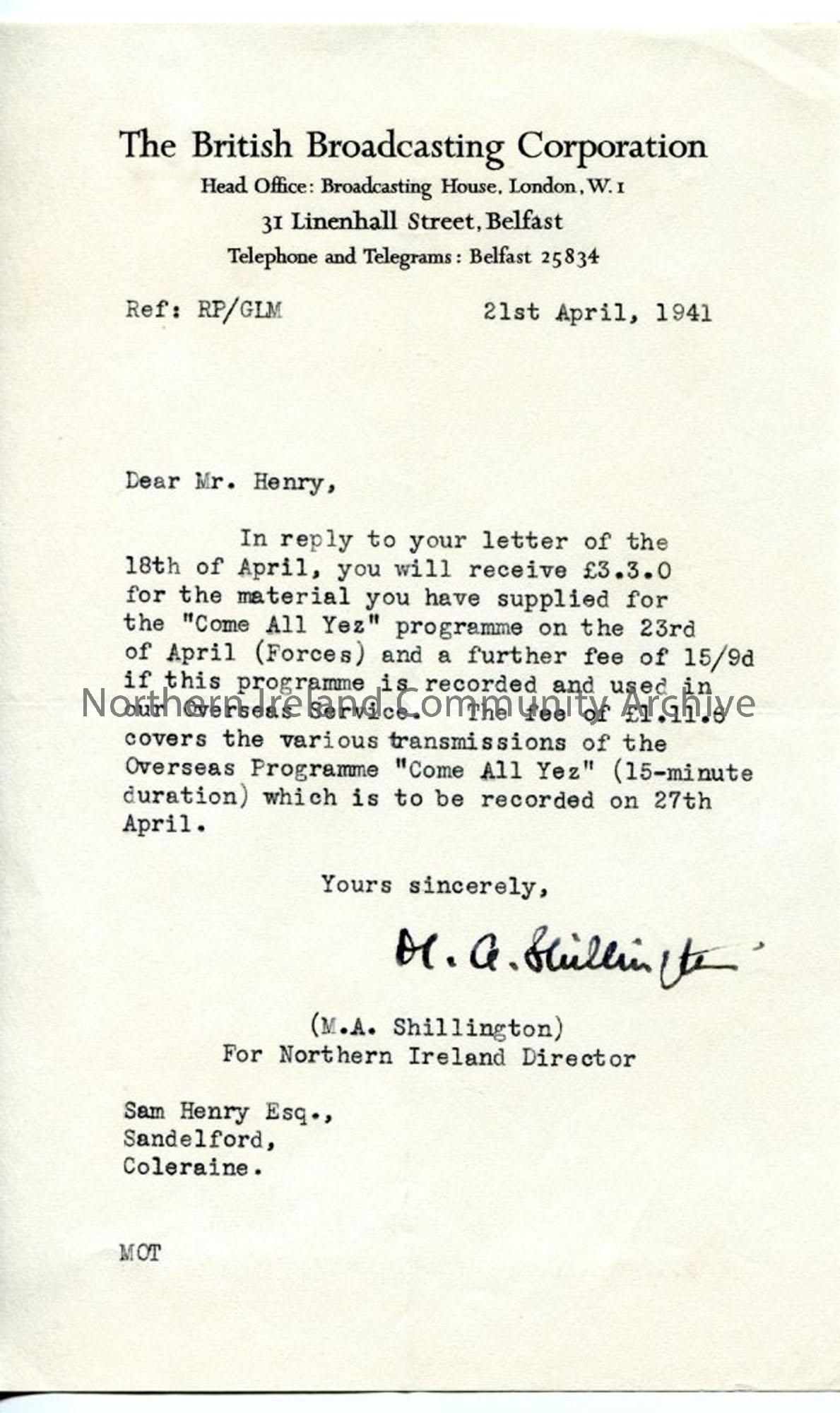 Letter from M A Shillington of the BBC, dated 21.4.1941