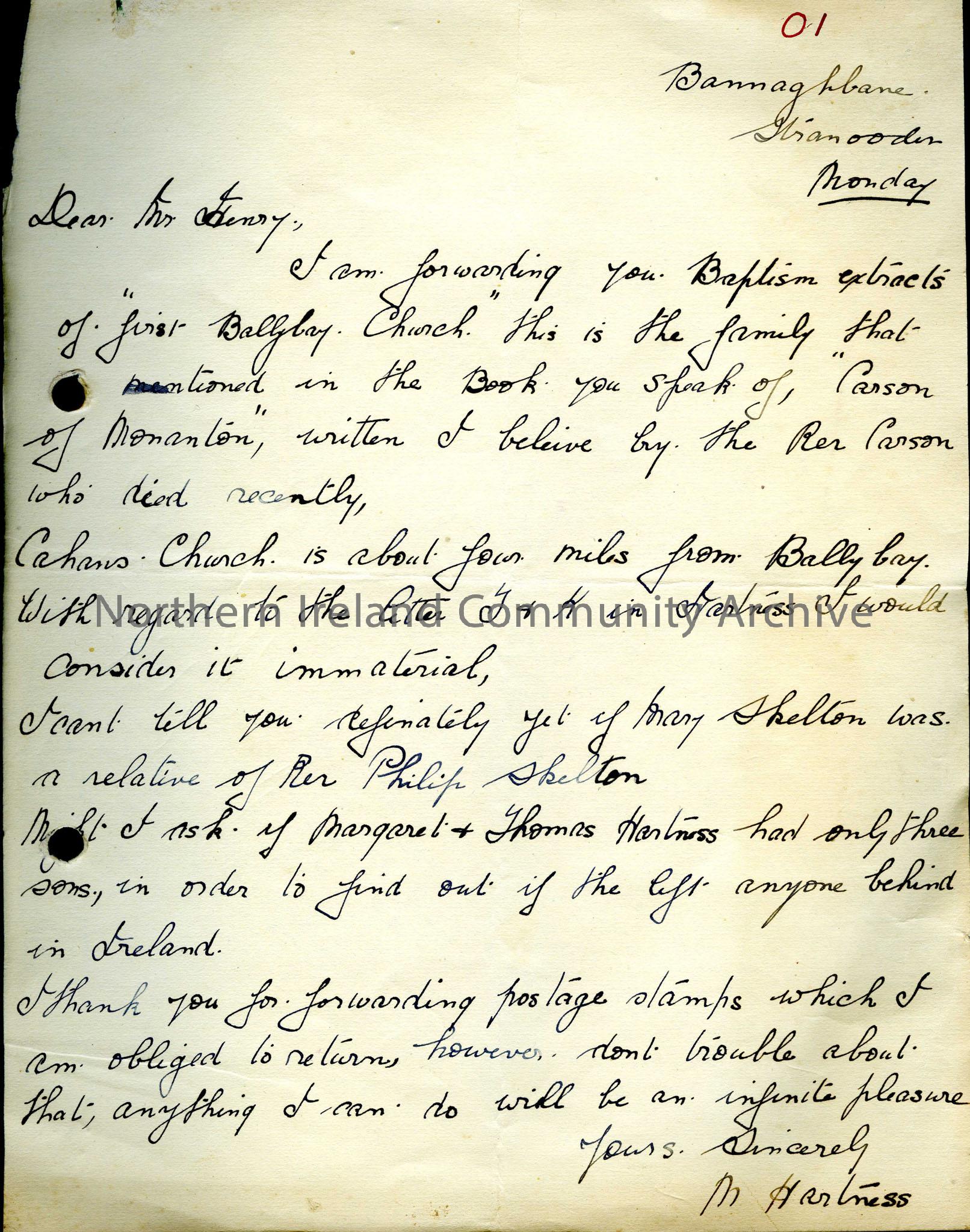Letter from M Hartness relating to the Harkness/Hartness family associated with Cahans Church, Co. Monaghan.It contains a list of Hartness baptism records from First Ballybay Church in Co. Monaghan.