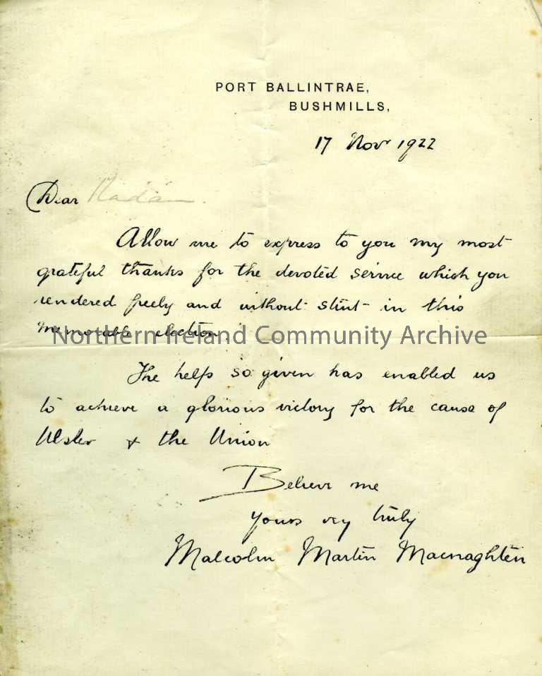 Letter from Malcolm Martin MacNaghten dated 17th November 1922, Portballintrae, Bushmills. The letter is thanking 'Madam' for her 'devoted service' which she offered to Malcolm during his election. He writes - 'The help so given has enabled is to achieve a glorious victory for the cause of Ulster and the Union'. Paper folded in two with writing on one side only.
