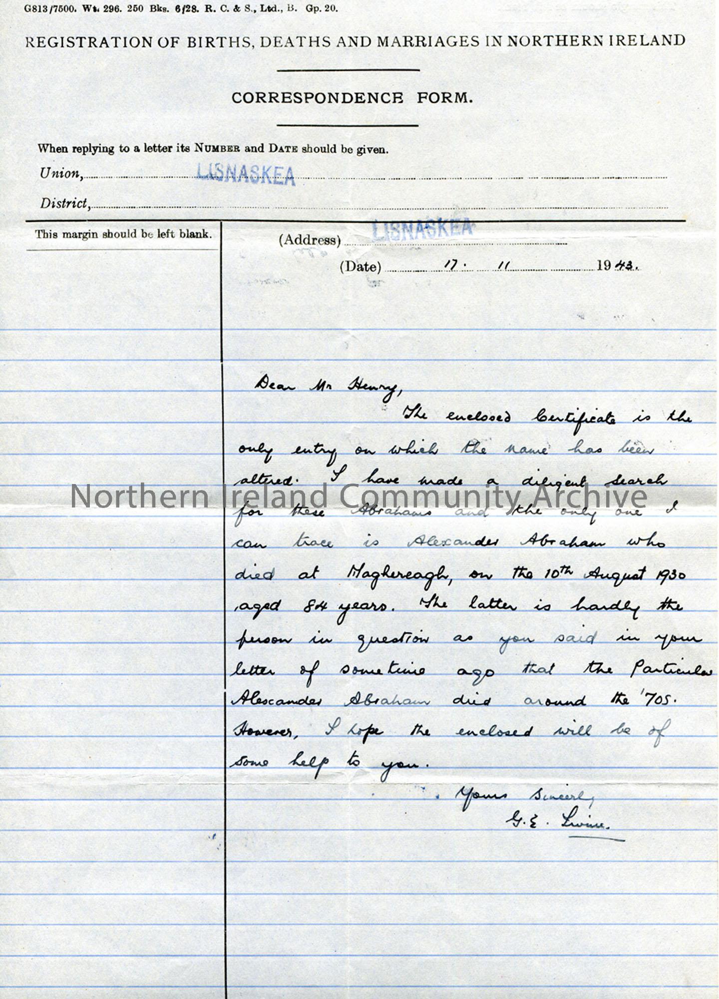 Handwritten letter to Sam Henry written on a 'Registration of Births, Deaths and Marriages In Northern Ireland' correspondence form. Encloses death certificate to help Sam in the trace of Abraham family.