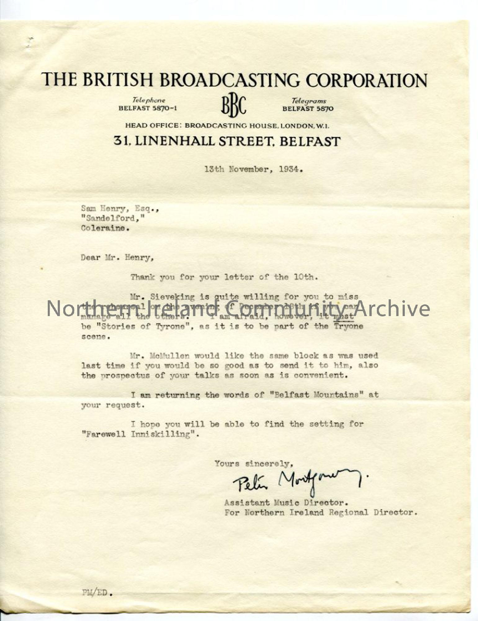 Typed letter from Peter Montgomery of the BBC, agreeing to Sam missing a rehearsal and stipulating that it must be Tyrone stories - relates to 'Christmas Tree' programme in December of 1934. Dated 13.11.1934.