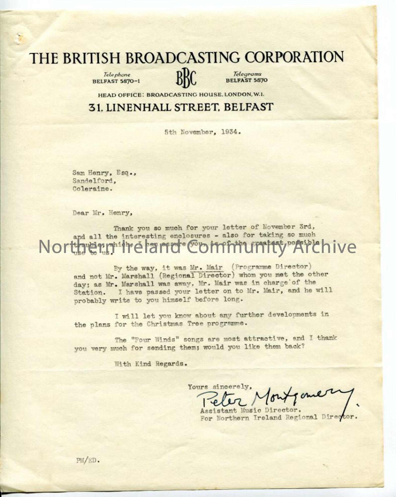 Typed letter from Peter Montgomery of the BBC, thanking Sam for information sent and will let him know of further developments in 'Christmas Tree' programme. Dated 5.11.1934.