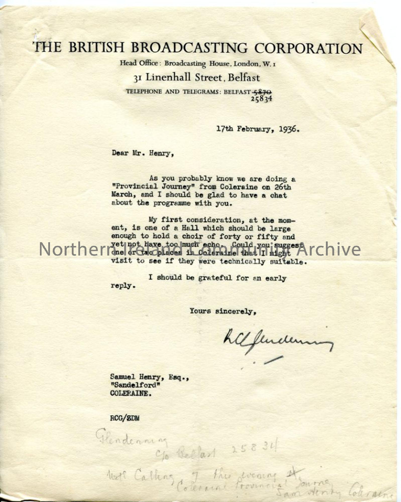 Typed letter on BBC headed notepaper from R C Glendenning, relating to the 'Provincial Journey' programme. Asks Sam for suggestions of place in Coleraine adequate in size to hold audience. Dated 17.2.1936.