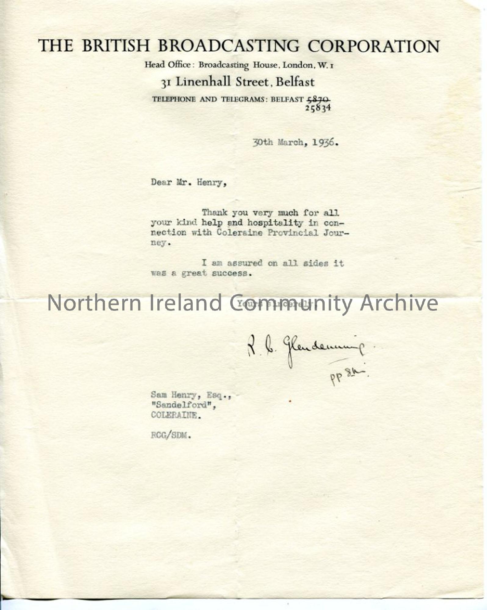 Typed letter on BBC headed notepaper from R C Glendenning, relating to the 'Provincial Journey' programme. Thanks Sam for his help on programme. Dated 30.3.1936.