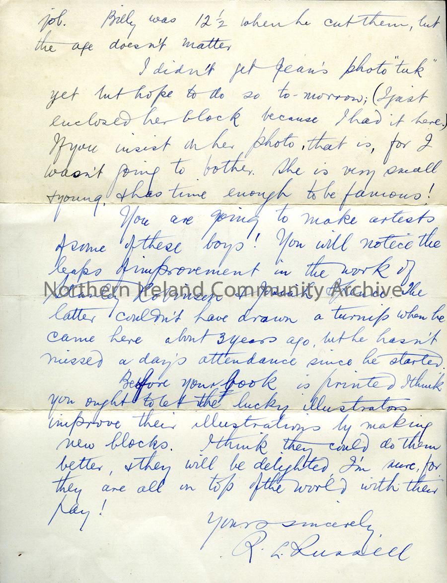 Double sided handwritten letter to Sam Henry. Dated 12th February, 1940. Writes re linocuts and those done by Billy Russell Jr of the fisherman 'codding' the clergyman and Sadie Stirling. He has tried to fix two blocks by Billy Russell Senior and discusses whether they will print well enough. Mentions using Jean's photo 'tuk'. Remarks on the improvments in the pupil's work and in particular that of Stanley Colinson and Josiah Spence. Suggests to Sam to let the pupils redo their blocks before his book is published.