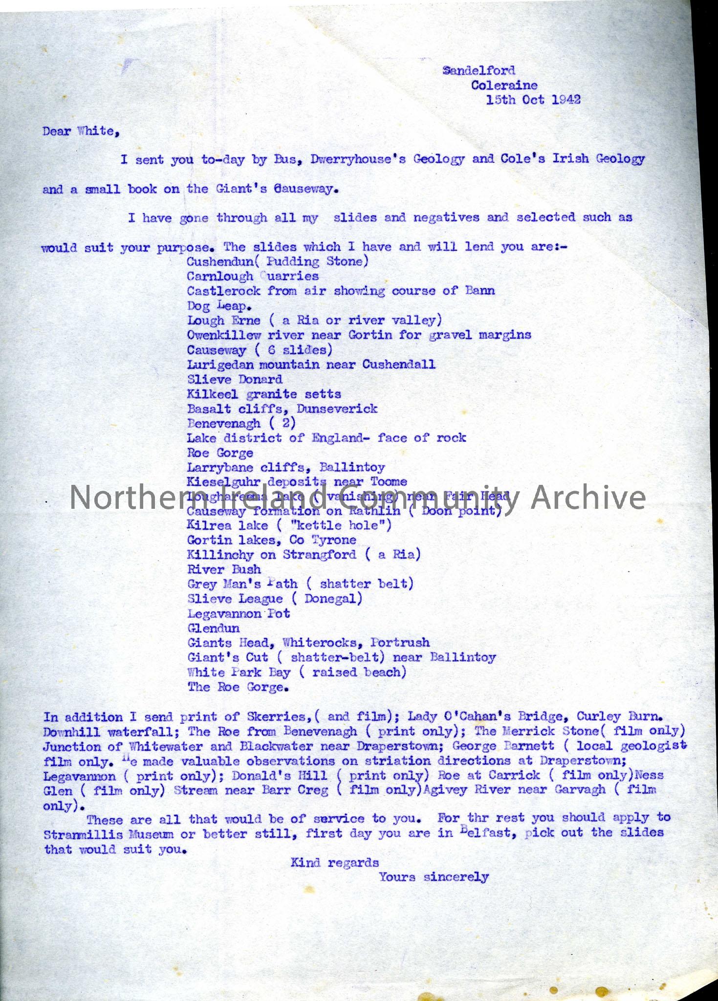 Letter from Sam Henry to a Mr. White. Sam seems to be lending him material for a lecture. He has sent two books, one on Irish Geology and one on the Giant's Causeway as well as several of his slides.