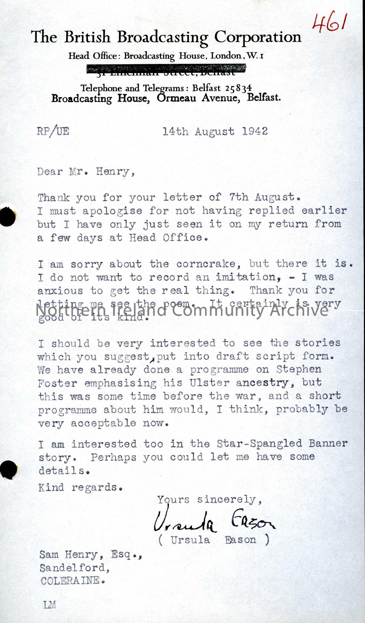 Letter from the Irish Broadcasting Station sugg...