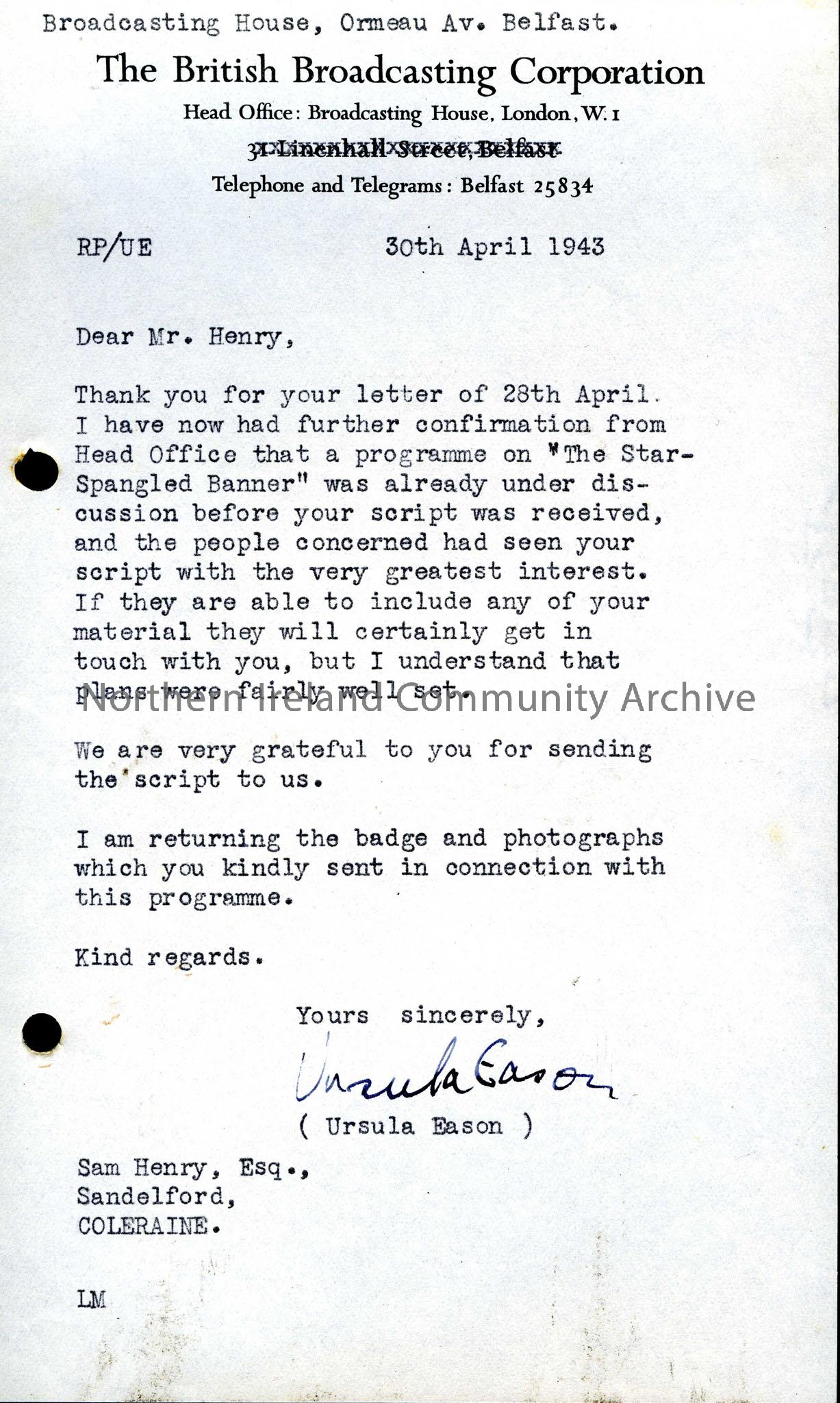 Letter from the BBC concerning a script for a programme on the Star Spangled Banner.