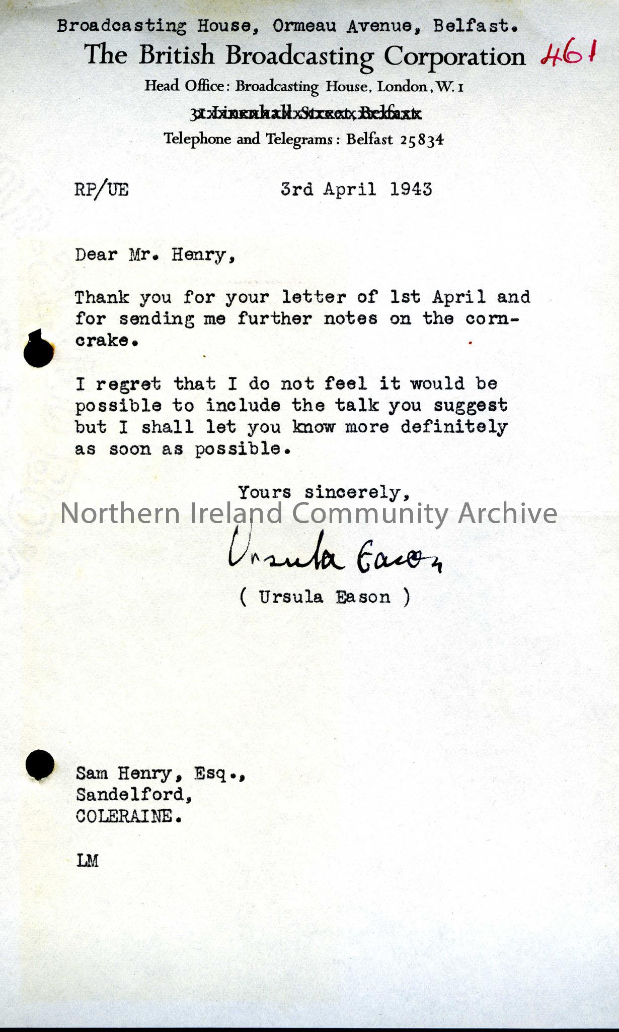 Letter from the BBC regarding notes on the corncrake sent by Sam Henry with a view to making a broadcast.