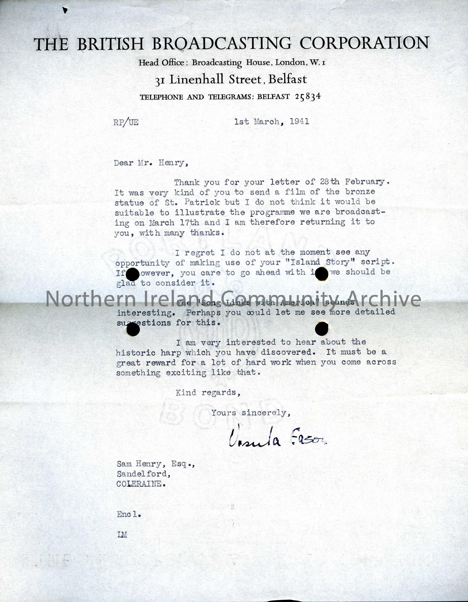 Letter from the BBC returning a film of a bronze statue of St. Patrick that is unsuitable for their 17th March broadcast. The letter mentions other scripts and Sam Henry's discovery of an historic harp.