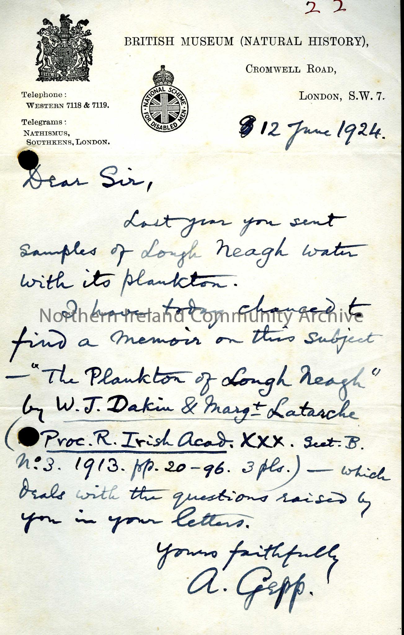 Letter from The British Museum (Natural History) referring to a sample of Lough Neagh water and its plankton sent to them by Sam Henry in the previous year.