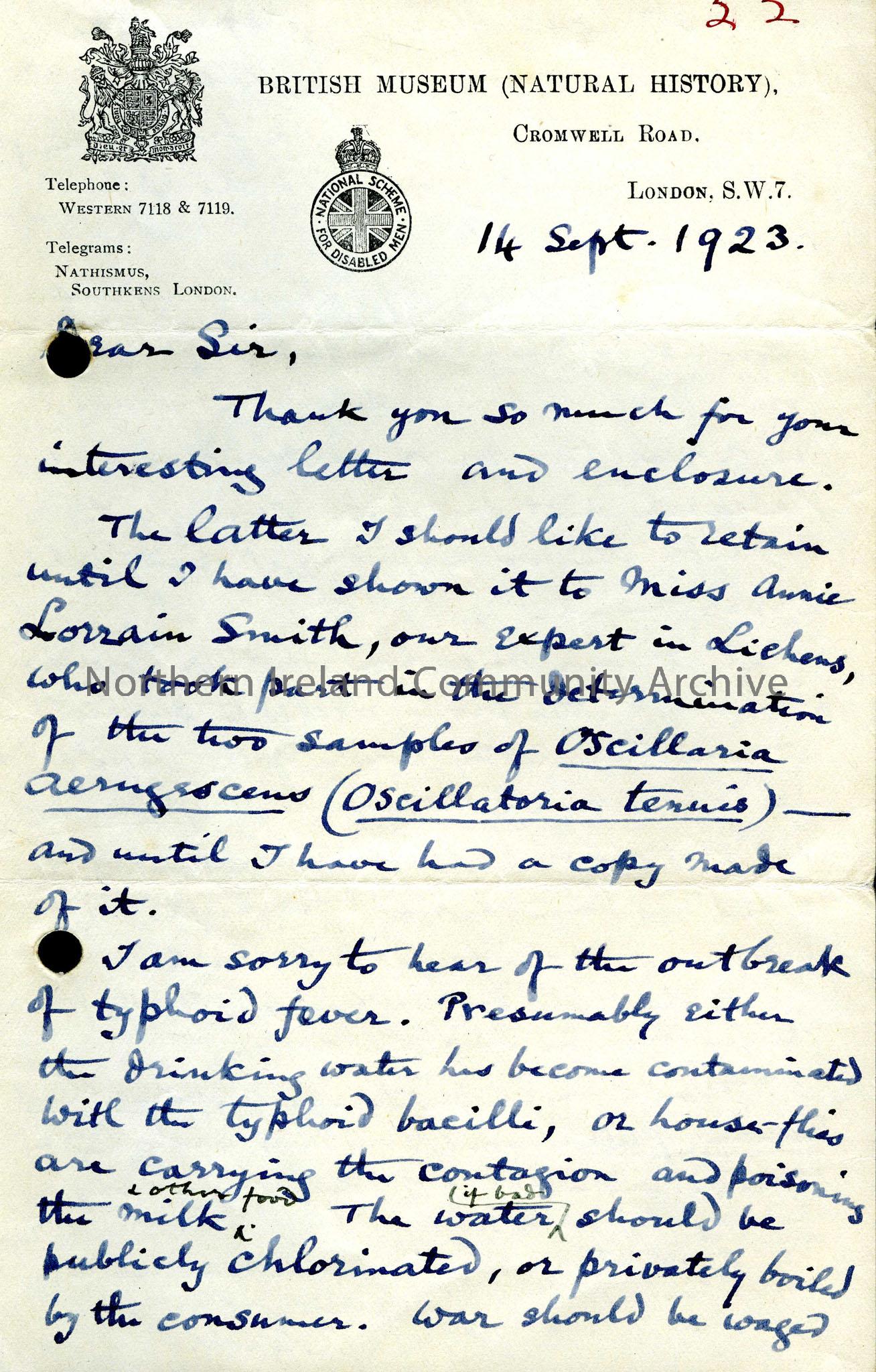 Letter from the British Museum (Natural History) thanking Sam Henry for his letter and enclosure. It mentions a typhoid outbreak.