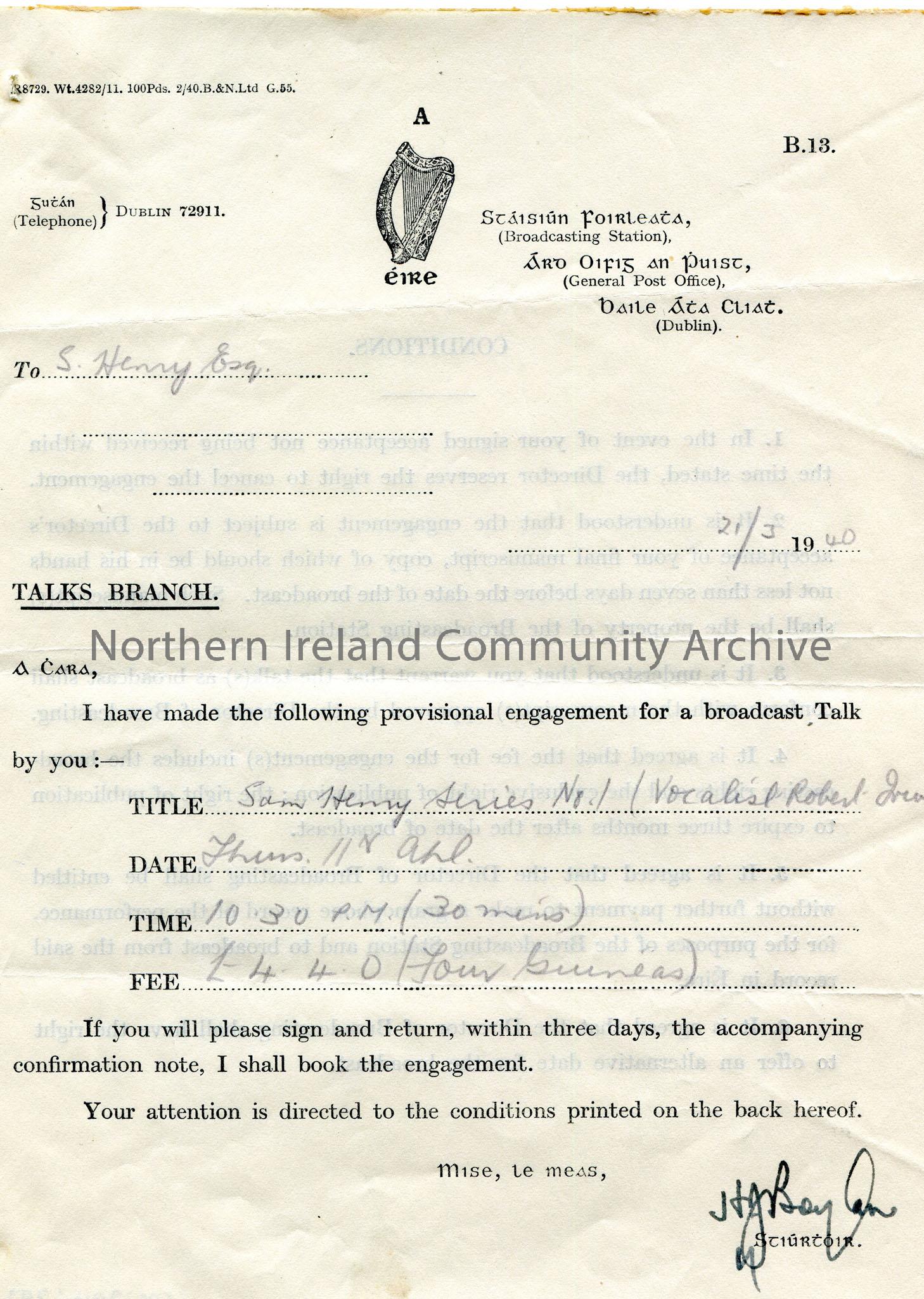 Letter from the Broadcasting Station, General Post Office, Dublin. Dated 21st March, 1940. Titled Talks Branch. Requesting for an engagement for a broadcast talk for Sam Henry Series No.1/Vocalist Robert Irwin, Thursday 11th April, 10.30pm, £4.4.0. Sam to sign and return attached confirmation. Conditions on reverse of page.