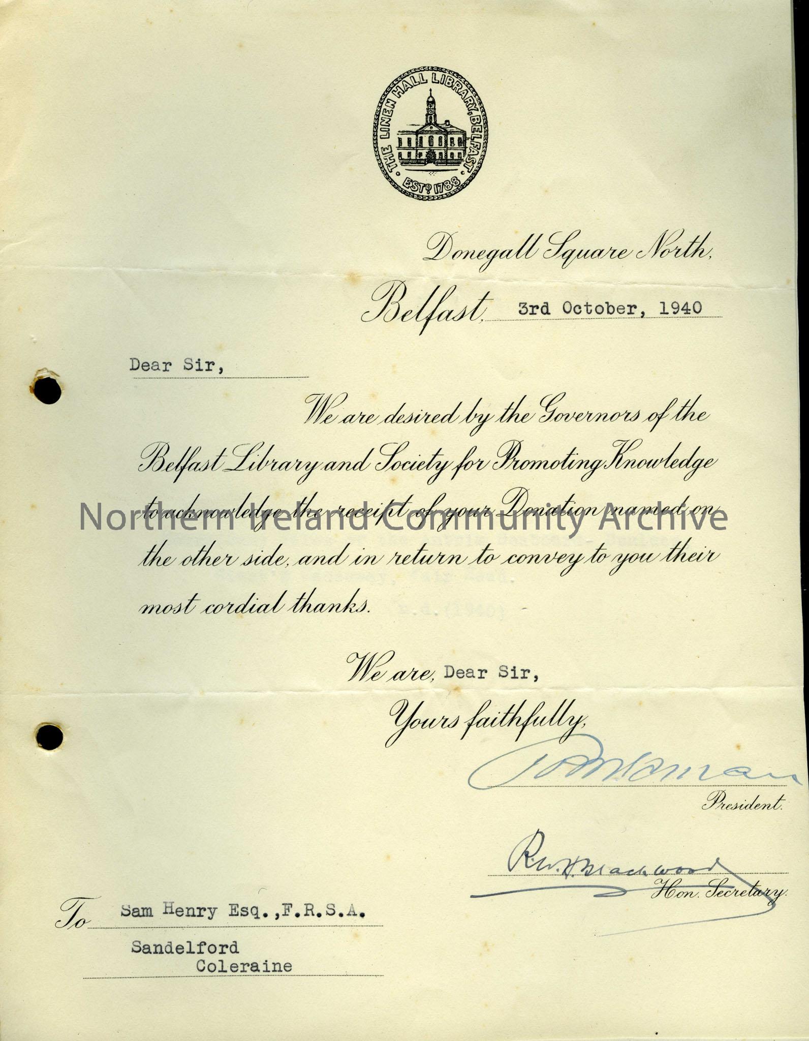 Letter from the Linen Hall Library thanking Sam Henry for donating a copy of "Tales of the Antrim Seaboard - Dunluce, Giant's Causeway, Fair Head". Signed by the President (name unreadable) and the Secretary.