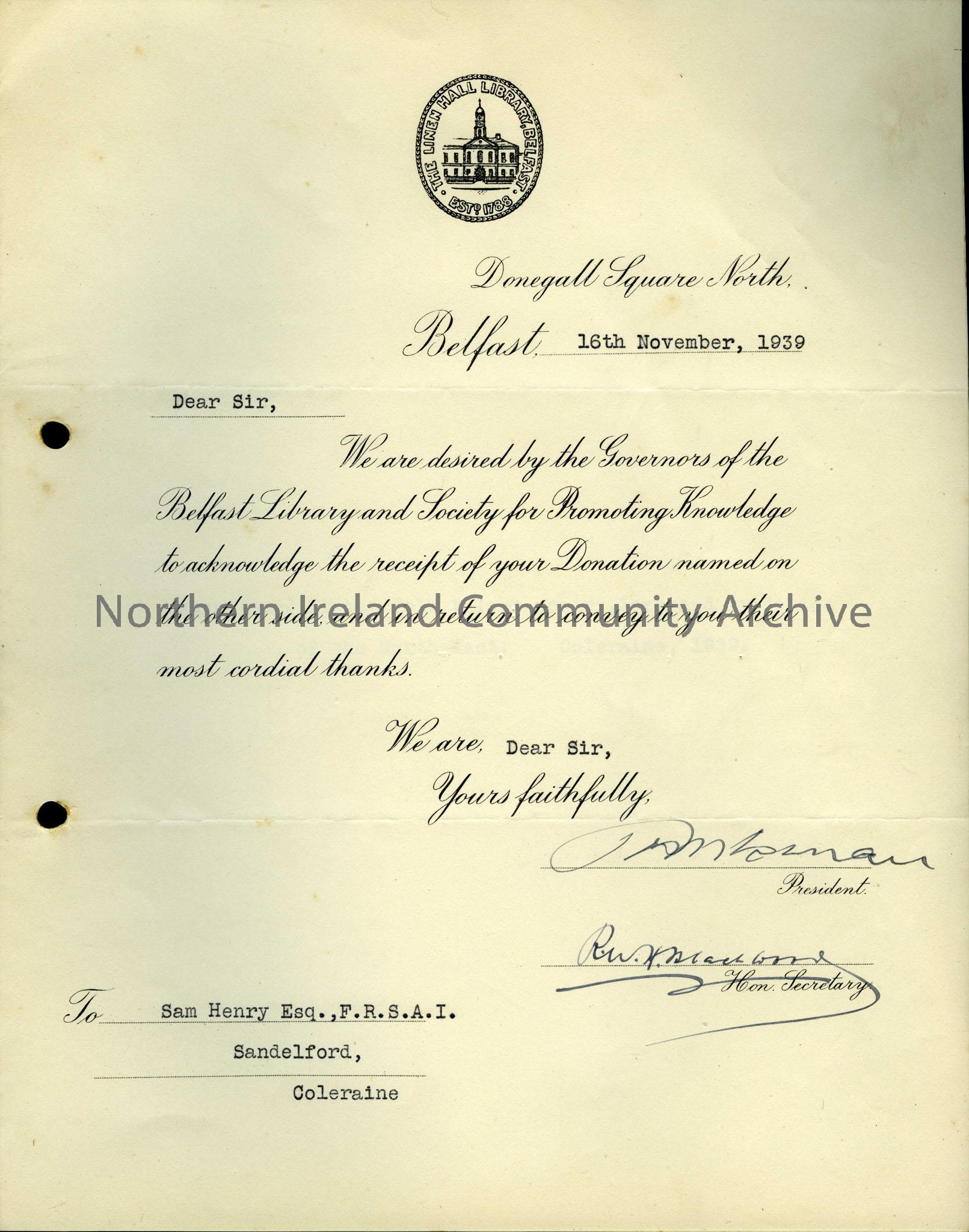 Letter from the Linen Hall Library thanking Sam Henry for donating a copy of "Ulster Folk Tales: poetry, lore and tradition of the North-East.. Signed by the President (name unreadable) and the Secretary.