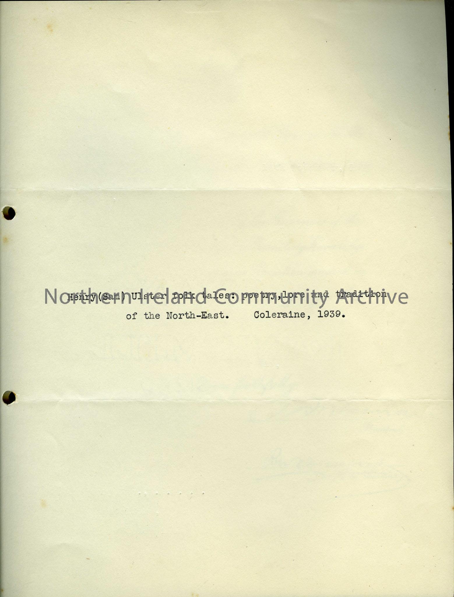 Letter from the Linen Hall Library thanking Sam Henry for donating a copy of “Ulster Folk Tales: poetry, lore and tradition of the North-East.. Signed…