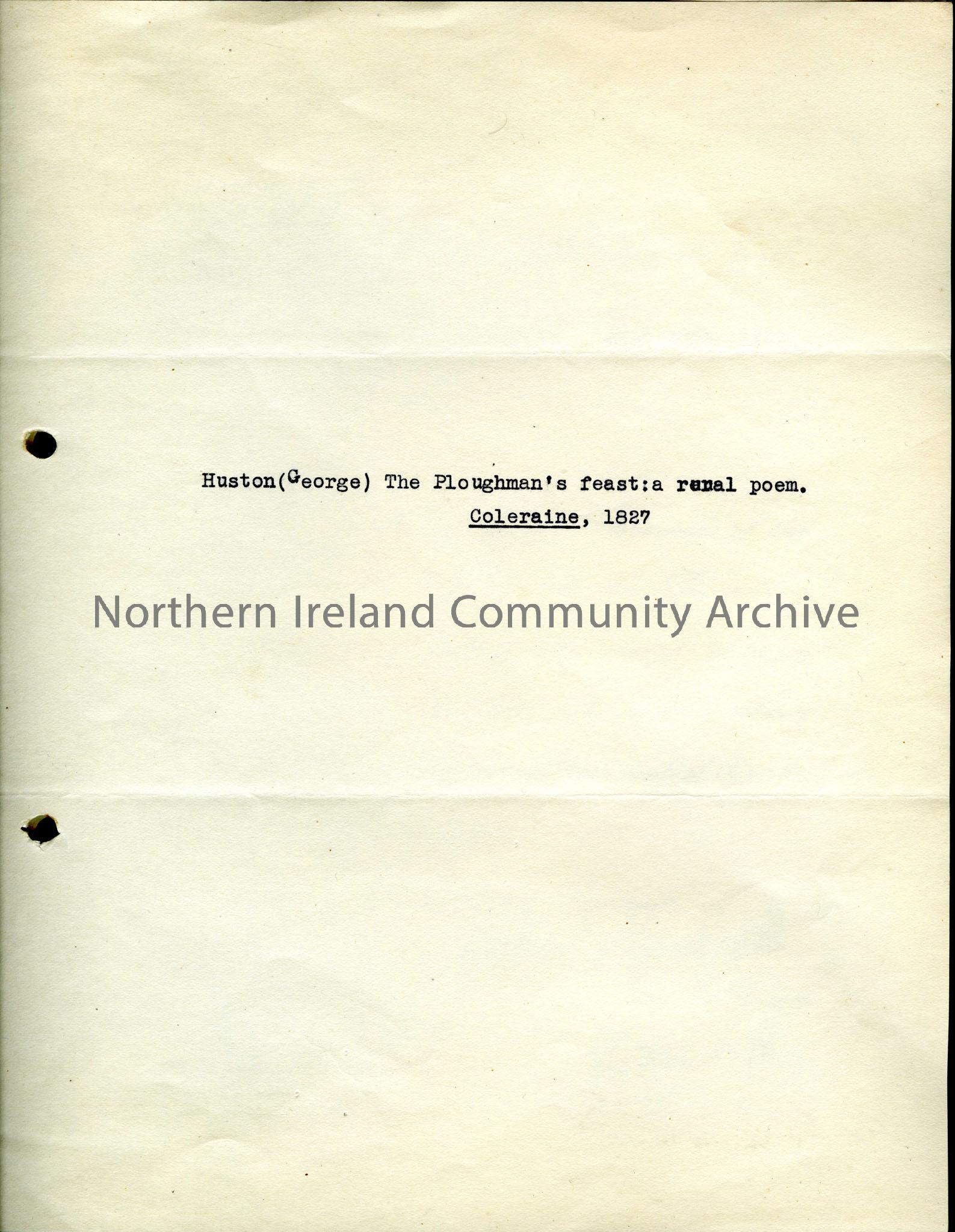 Letter from the LInenhall library thanking Sam Henry for the donation of an item by George Huston entitled, "The Ploughman's feast: a rural poem. Coleraine, 1827.