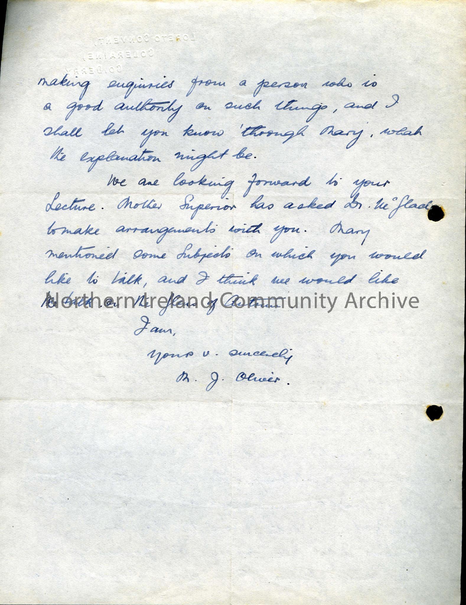 Letter from the Loreto Convent in Coleraine discussing the meaning of various placenames and requesting that Sam henry’s forthcoming talk be on the su…