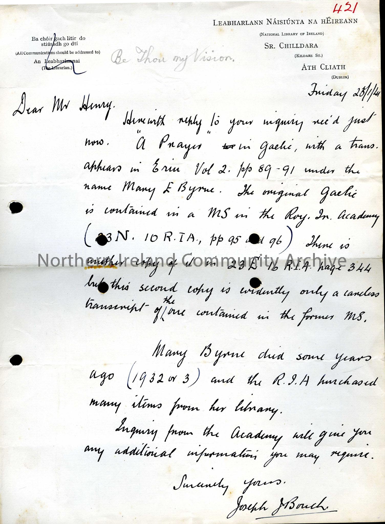 Letter from the National Library of Ireland in response to Sam Henry's enquiry about the Irish prayer translated by Mary E Byrne as "Be Thou My Vision."