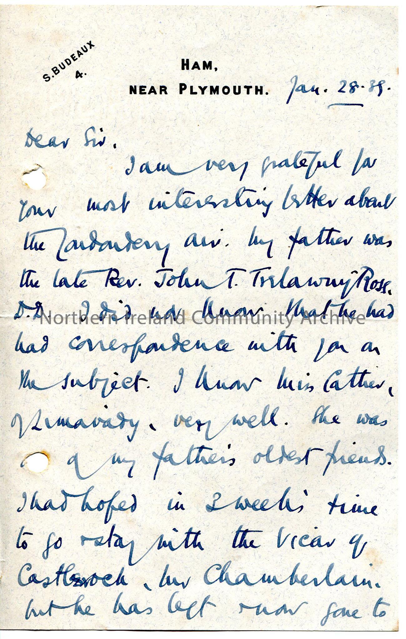 Letter from Trelawney-Ross’s son, re correspondence between his father and Sam Henry and letter received by him about Londonderry Air