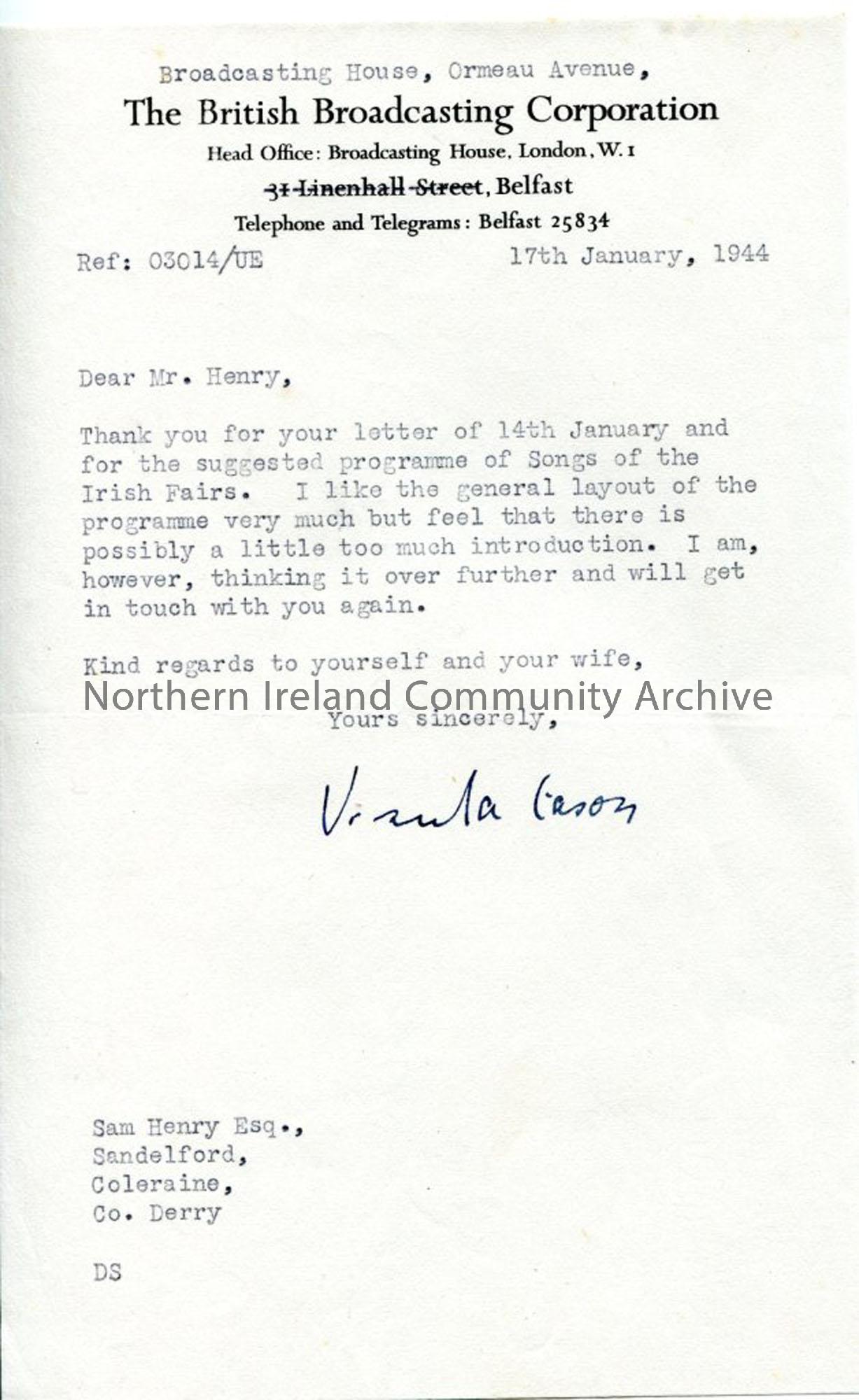 Typed letter from Ursula Eason of the BBC re: proffered script 'Songs of the Irish Fairs' as discussed, with comments on same - no definite decision made on programme. Dated 17.1.1944.