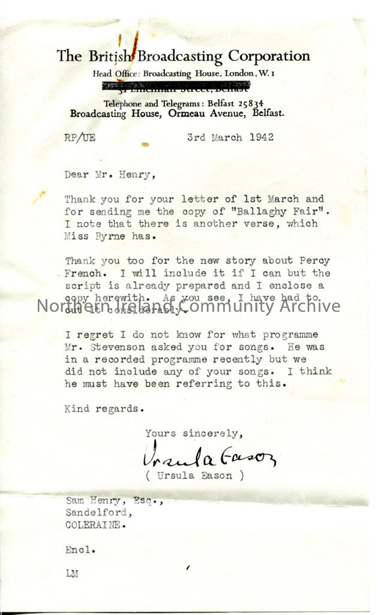 Typed letter on BBC headed notepaper from Ursula Eason. Thanks Sam for verses to song, story about Percy French, encloses script for Percy French programme. Dated 3.3.1942.