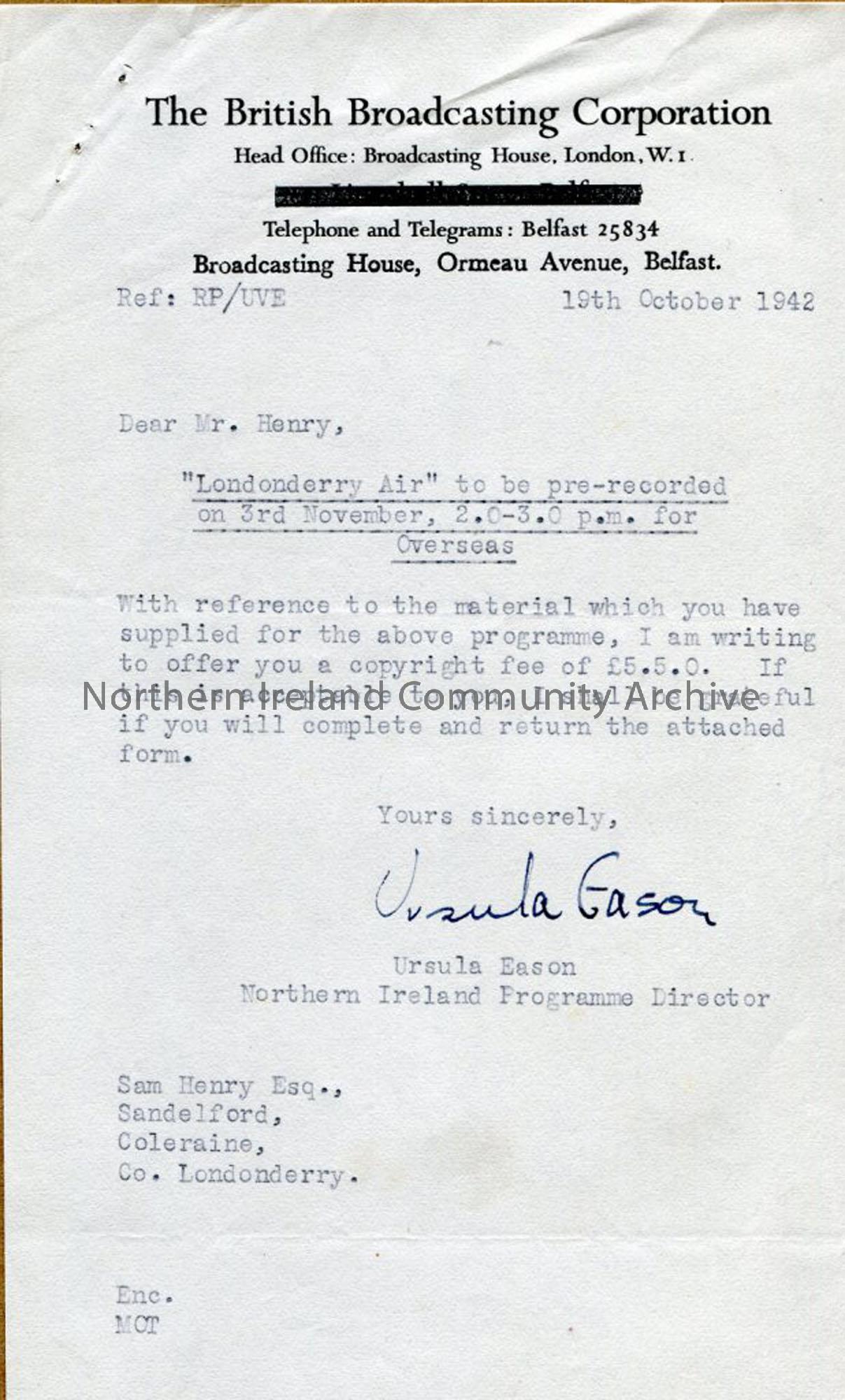 Typed letter from Ursula Eason, Northern Ireland Programme Editor, BBC, dated 19.10.1942. Offering copyright fee of 5 guineas for material supplied by Sam Henry for programme on 'Londonderry Air'.