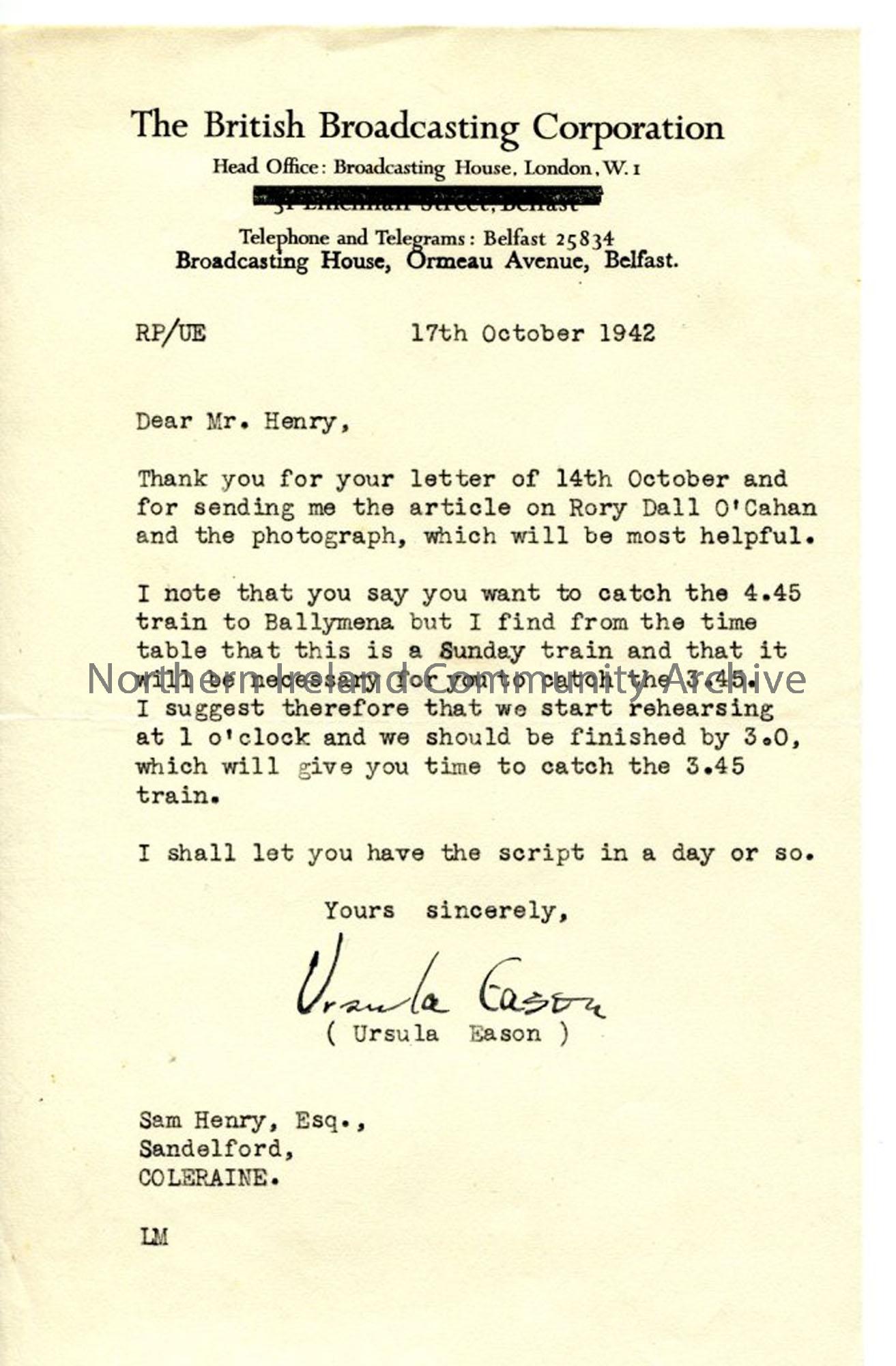Letter from Ursula Eason, BBC, dated 17.10.1942