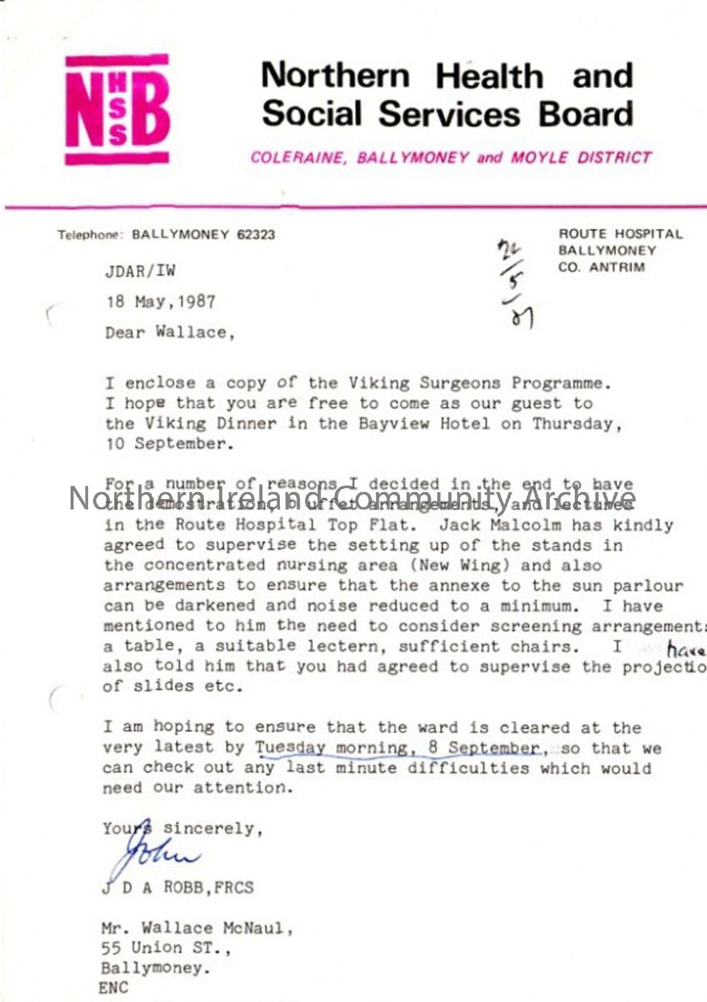 Letter headed correspondance regarding the Viking Surgeons annual dinner including programme. Dated 18th May 1987 and addressed to Wallace McNaul.