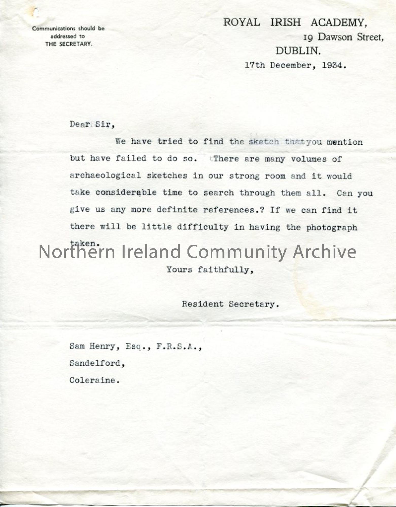 Typed letter on headed paper of Royal Irish Academy. Cannot find archaeological sketch Sam is looking for - need more information to identify it. Unsigned, dated 17.12.1934.