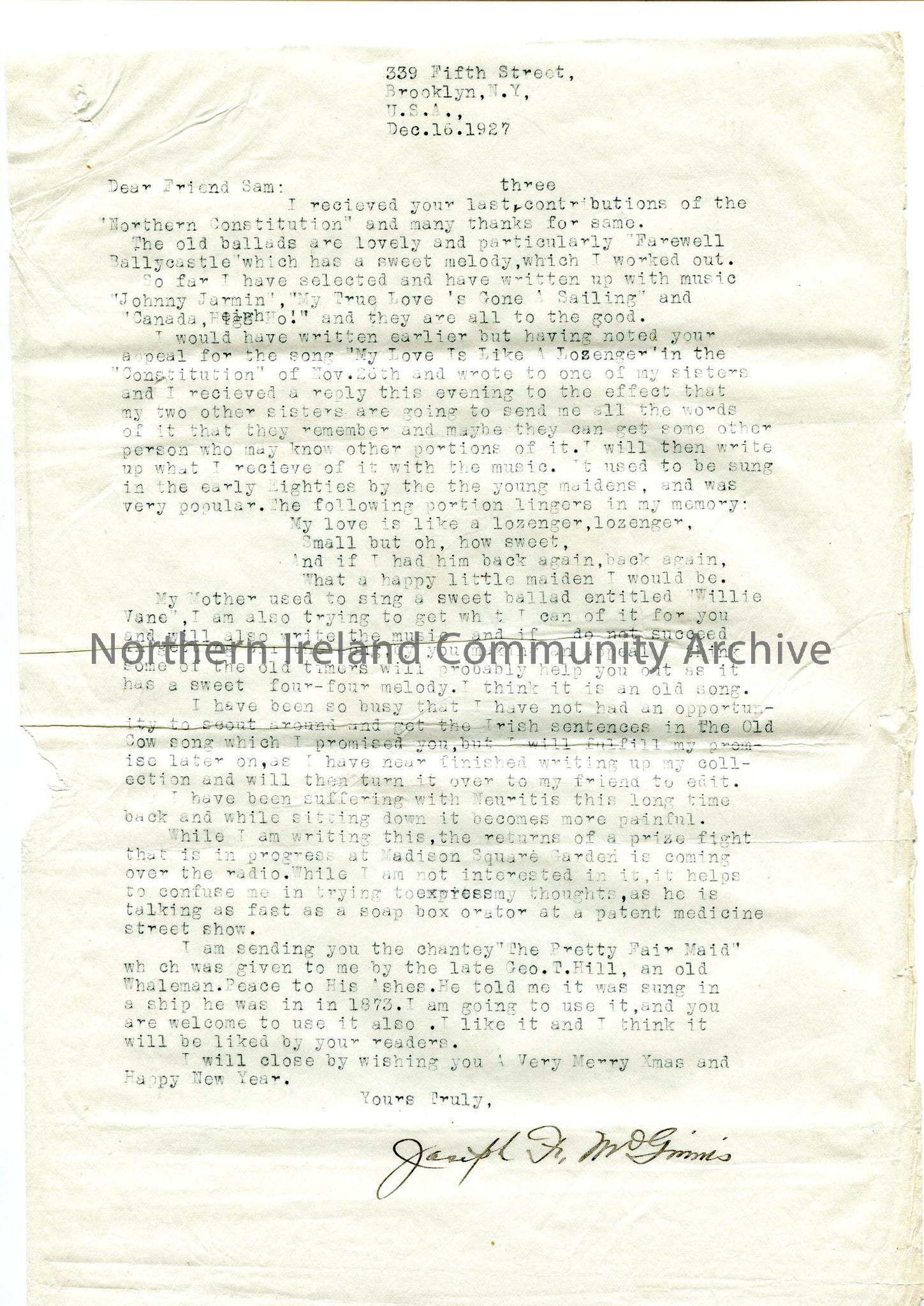 Letter re news of more songs. One of a bundle of documents pinned together, from Joseph McGinnis, who had a keen interest in songs sung by sailors.