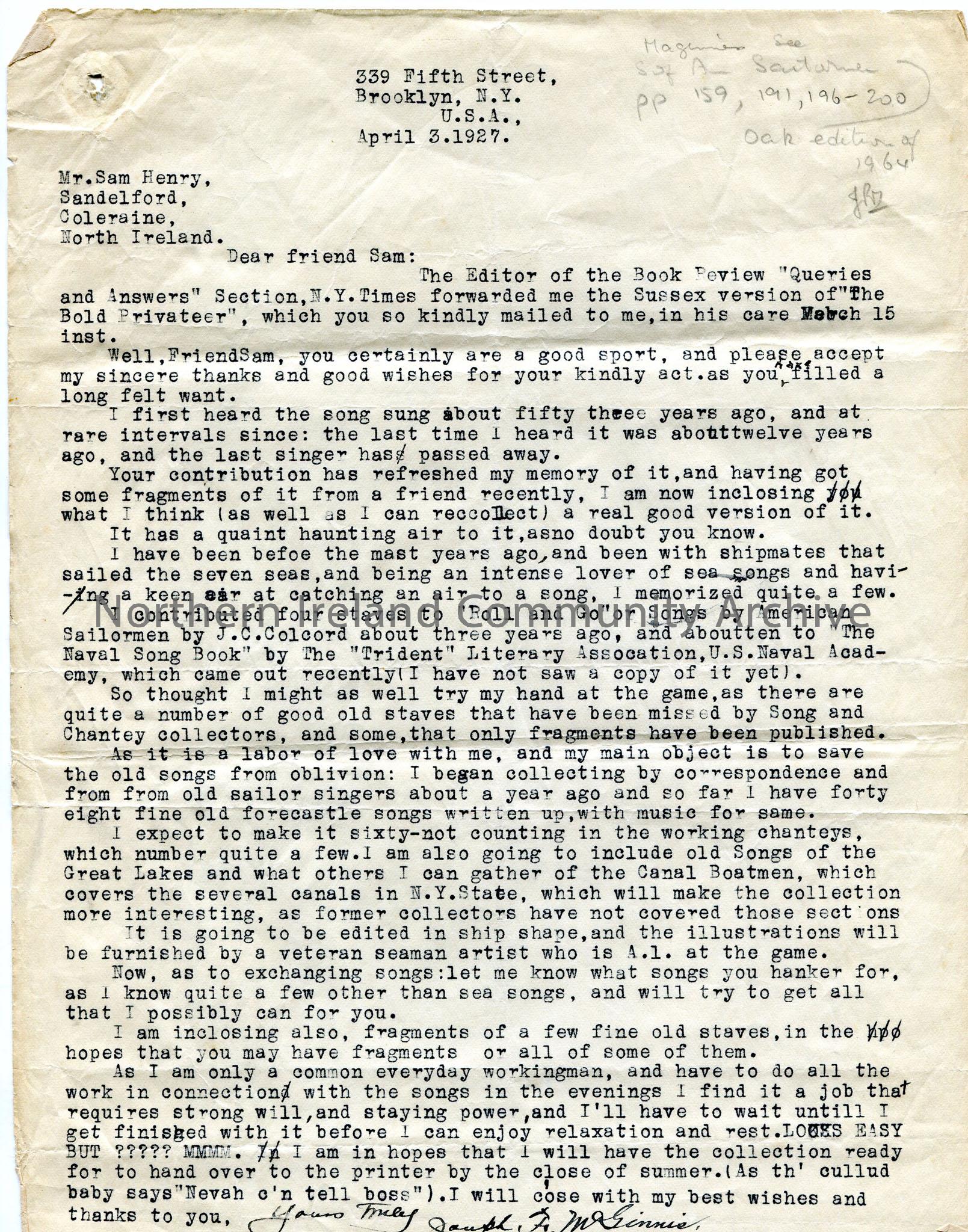 Letter re songs of interest and thanking Sam for songs he has sent. One of a bundle of documents pinned together, from Joseph McGinnis, who had a keen interest in songs sung by sailors.