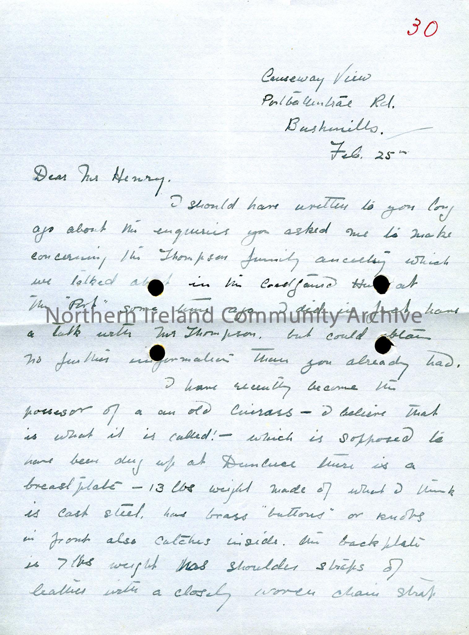 Letter regarding an enquiry about the Thompson family. The correspondent goes on to describe a cuirass (body armour) in their possession that was dug up at Dunluce.