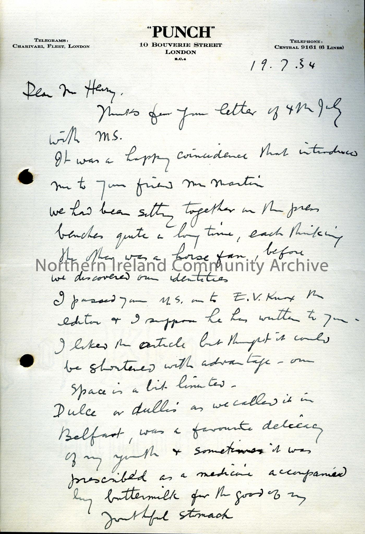Letter thanking Sam Henry for a MS sent to "Punch". The article appears to have been on the subject of dulse. The writer mentions the artist E. H. Shepard and Douglas whose play was being produced by the Ulster players. This was probably James Douglas, a Coleraine playwright.He also mentions "Thompson in Tirnanogue", a play written by his brother.