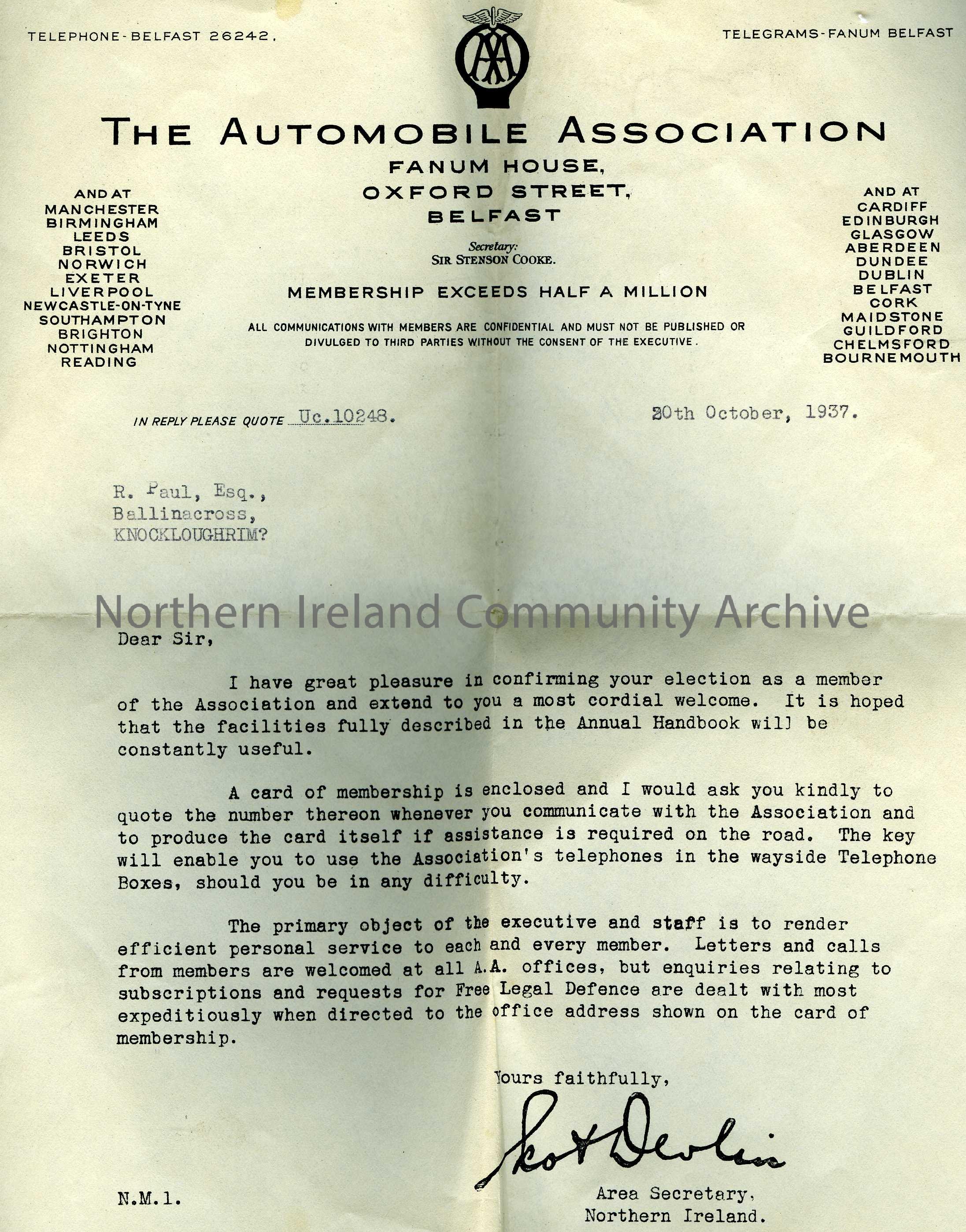 letter titled, The Automobile Association