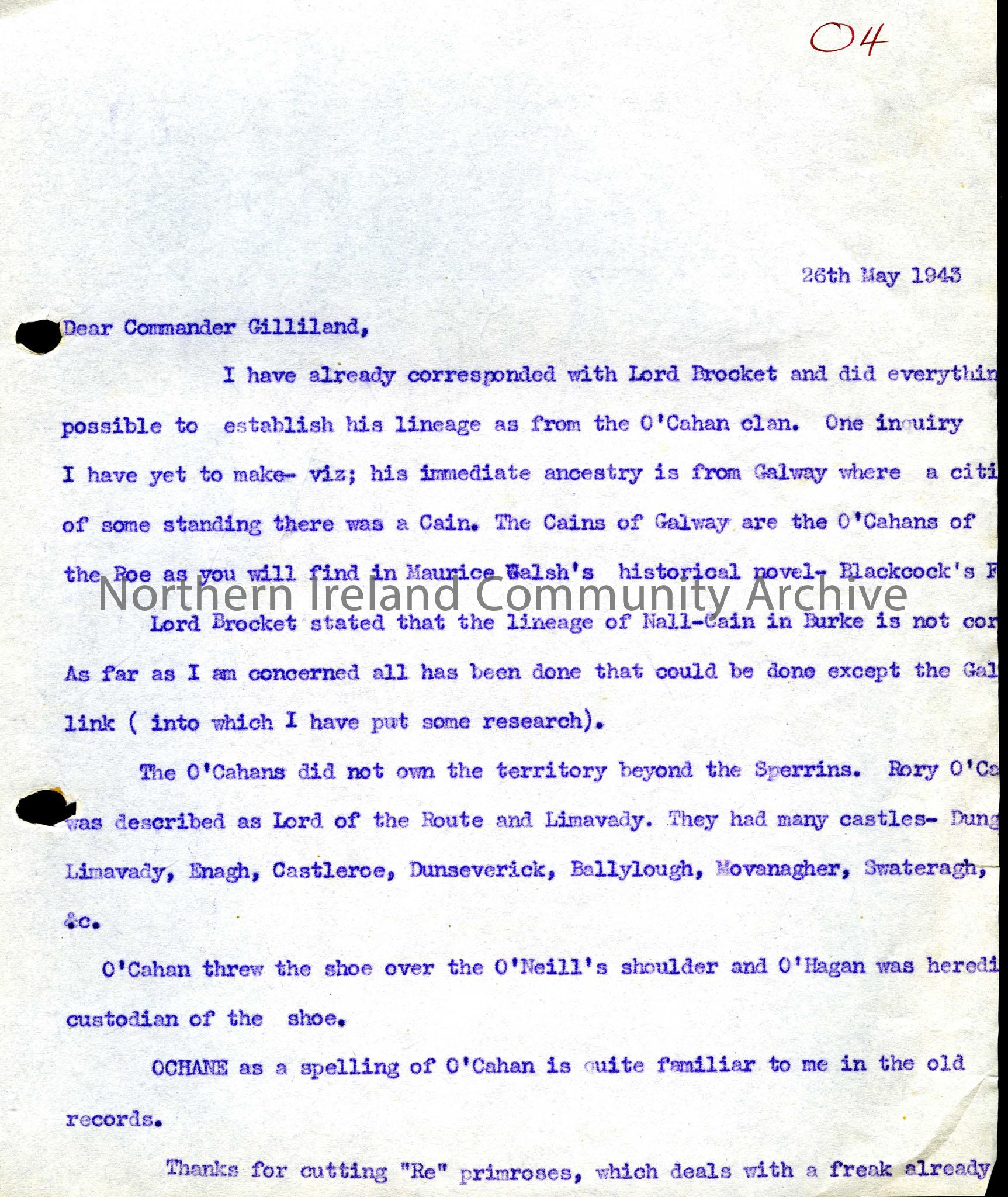 Letter to Commander Gilliland referring to previous correspondence with Lord Brocket about his possible descent from the O'Cahan clan and containing information on the O'Cahans.