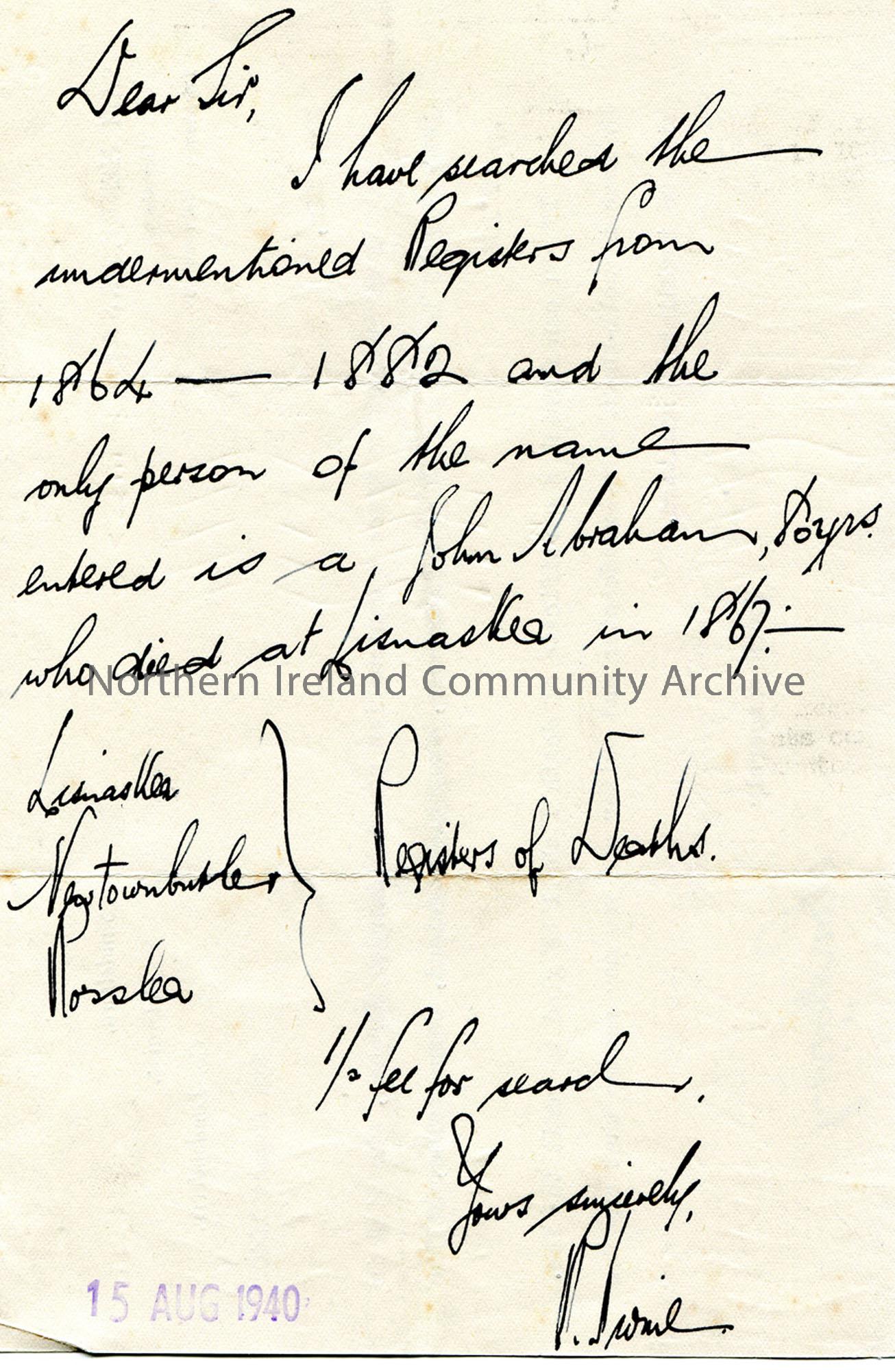 Typed letter to 'Dear Sir' on personal headed paper. Sam is conducting research for James Johnston Abraham and is tracing Alexander Abraham who died at the age of 106 at Carneyholme. He will pay a fee for the services. On the back of the page is a written reply to the letter stating that they have only found a John Abraham. They had checked the Lisnaskea, Newtownbutler and Rosslea Registers of Deaths.