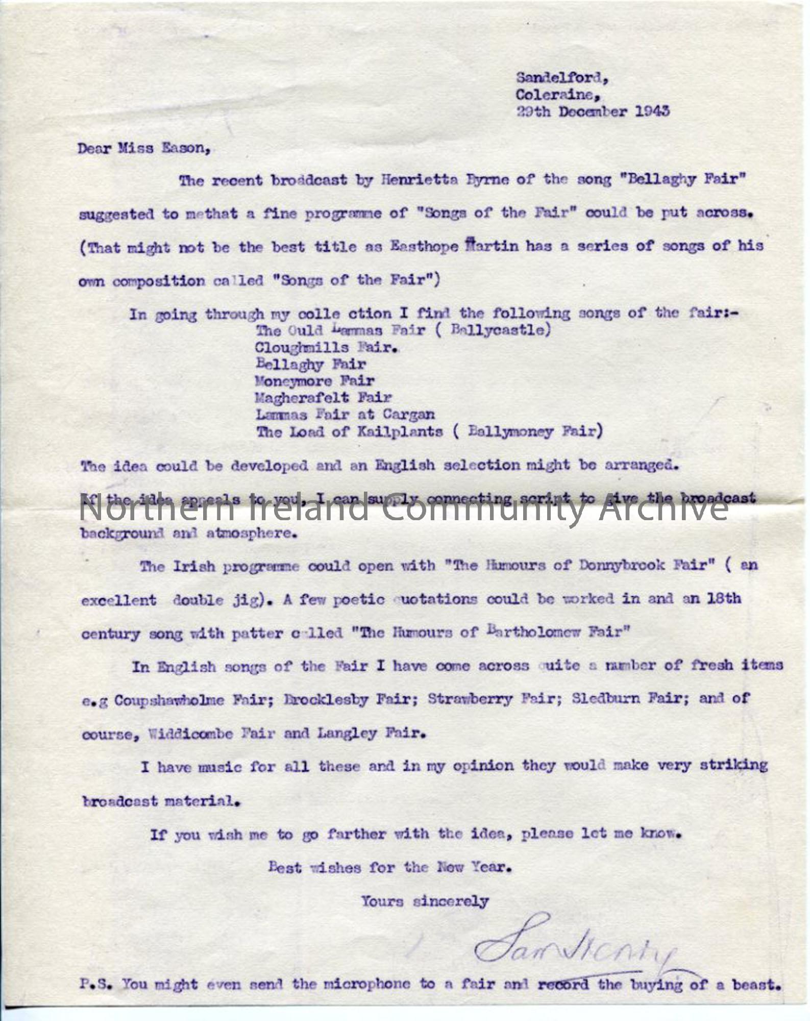 Typed letter to Miss Eason (Ursula Eason - Sam's contact at BBC in Belfast) - suggesting a programme on 'Songs of the Fair', which Sam can supply a script for. Dated 29.12.1943.