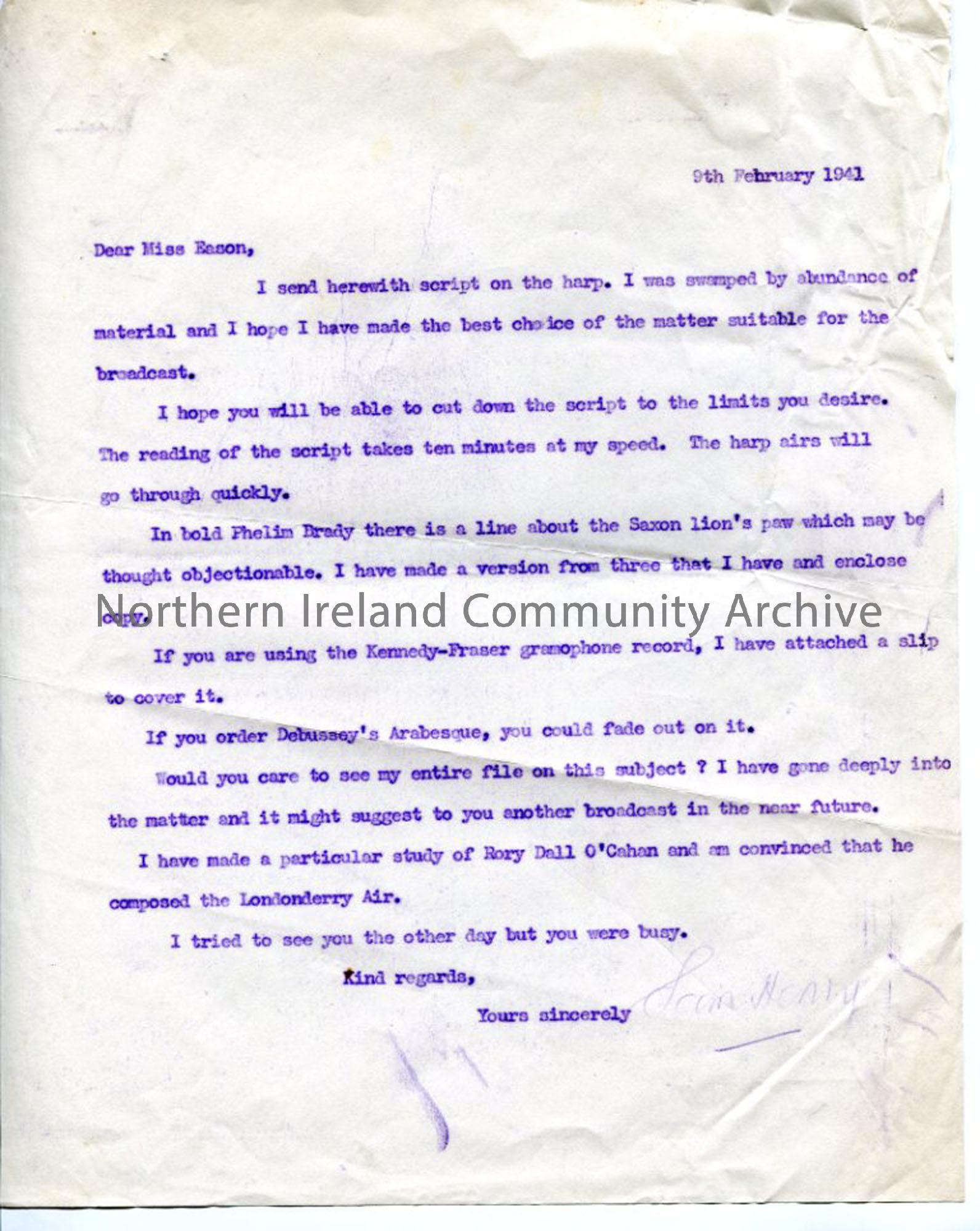 Typed letter to Miss Eason - contact at BBC in Belfast - re: script for broadcast on harp music, suggesting a further programme on Rory Dall O'Cahan due to his extensive research on subject. Dated 9.2.1941.