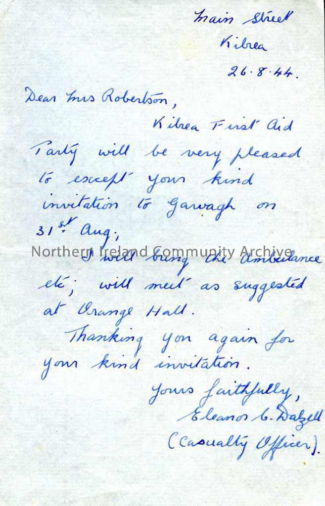 Letter to Mrs Roberston from Eleanor Dazell (Casualty Officer), dated 26.8.1944, accepting Mrs Robertson's invitation to the exercise in Garvagh on the 31st August 1944 on behalf of Kilrea First Aid Party.