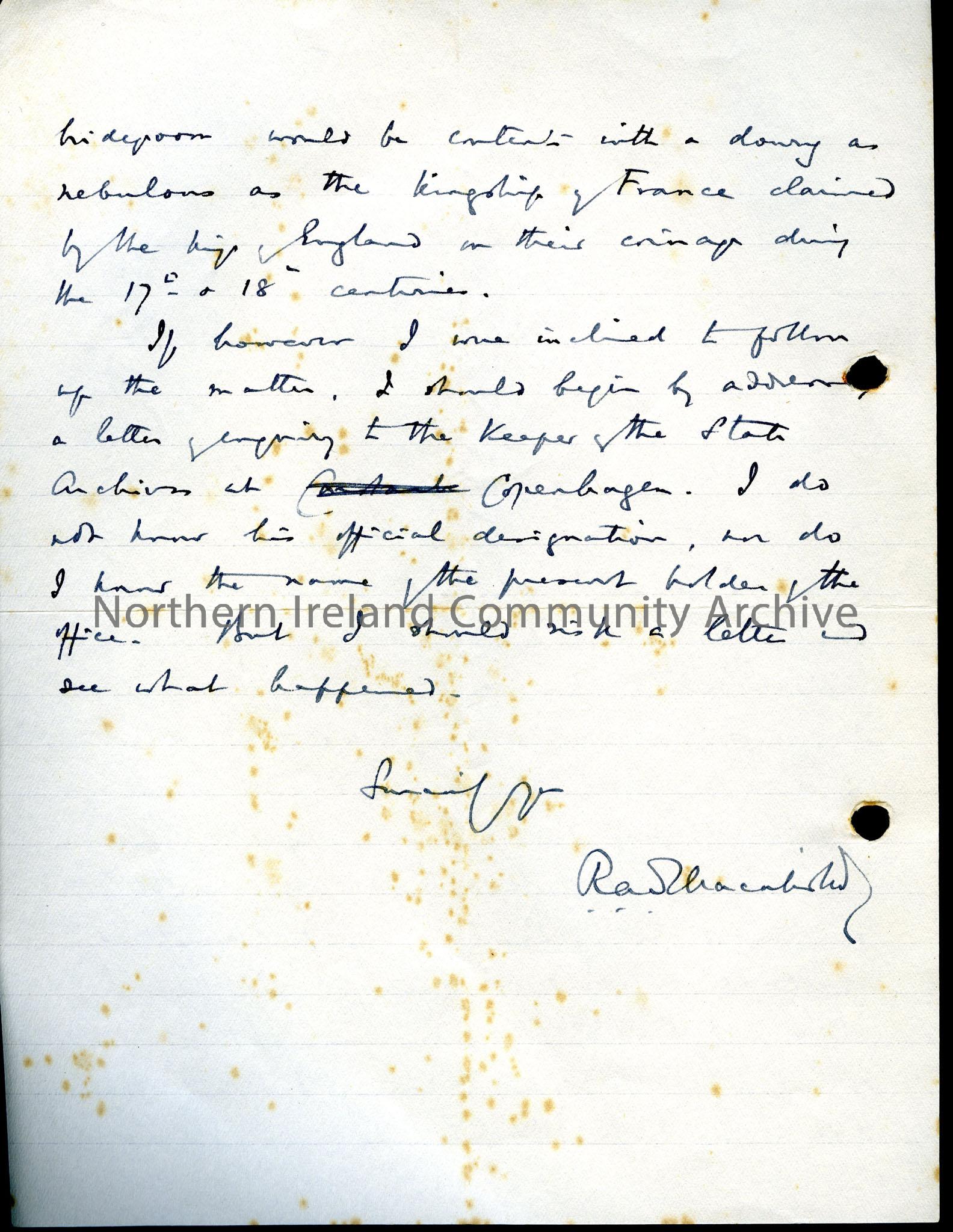 Letter to Sam Henry c/o Sir D. McAlister Bart, Oban, Argyll, dated 11th August 1933. Re: an inscription that Sam has sent for translation. – Scan169B