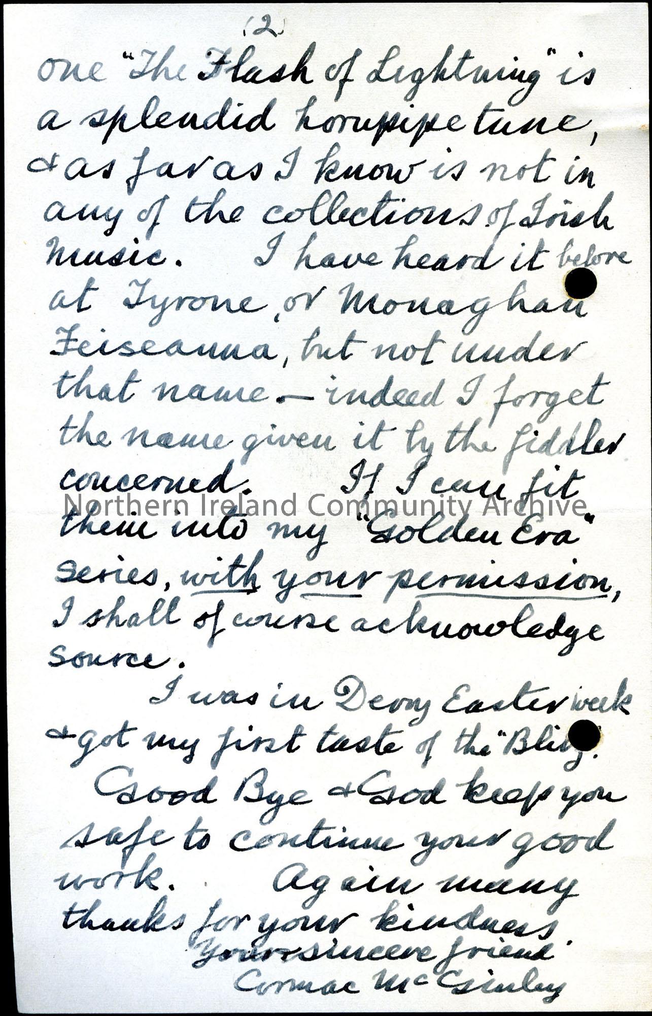 Letter to Sam Henry from Cormac McGinley, 36 Lower Kimmage Road, Dublin, dated 27 April 1941. Mr McGinley was thanking Sam Henry for sending three songs- 'She's a Grand Old Dame', 'The Turfahun Barn Dance, and 'The Flash of Lightning'. Mr McGinley seeks Sam's permission to use the songs in his 'Golden Era' series.