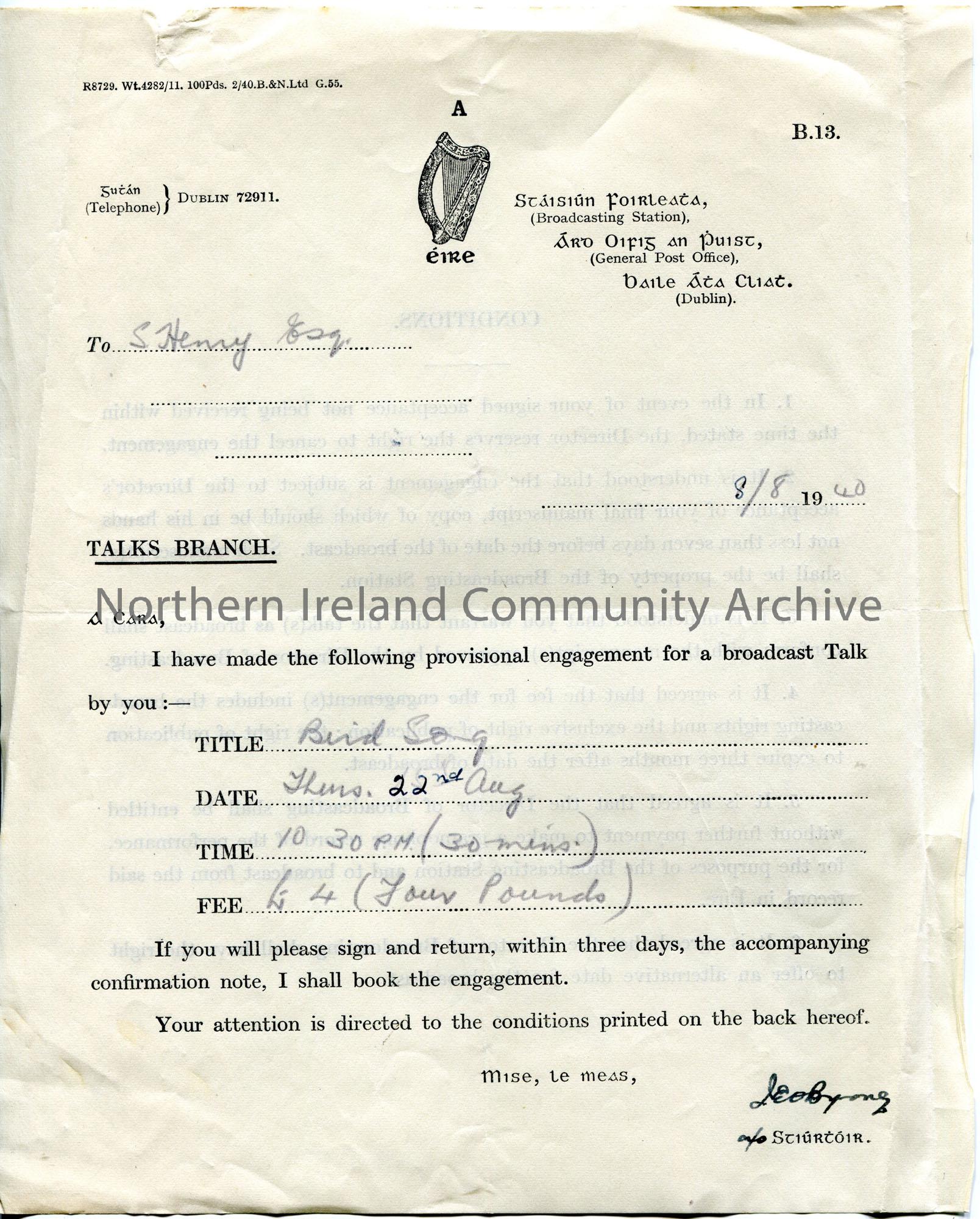 Letter to Sam Henry from Radio Éireann. Details of a provisional engagement for a broadcast Talk titled, 'Bird Song' on 22nd August 1940 at 10.30pm for a fee of £4. Conditions of the engagement are printed on reverse.