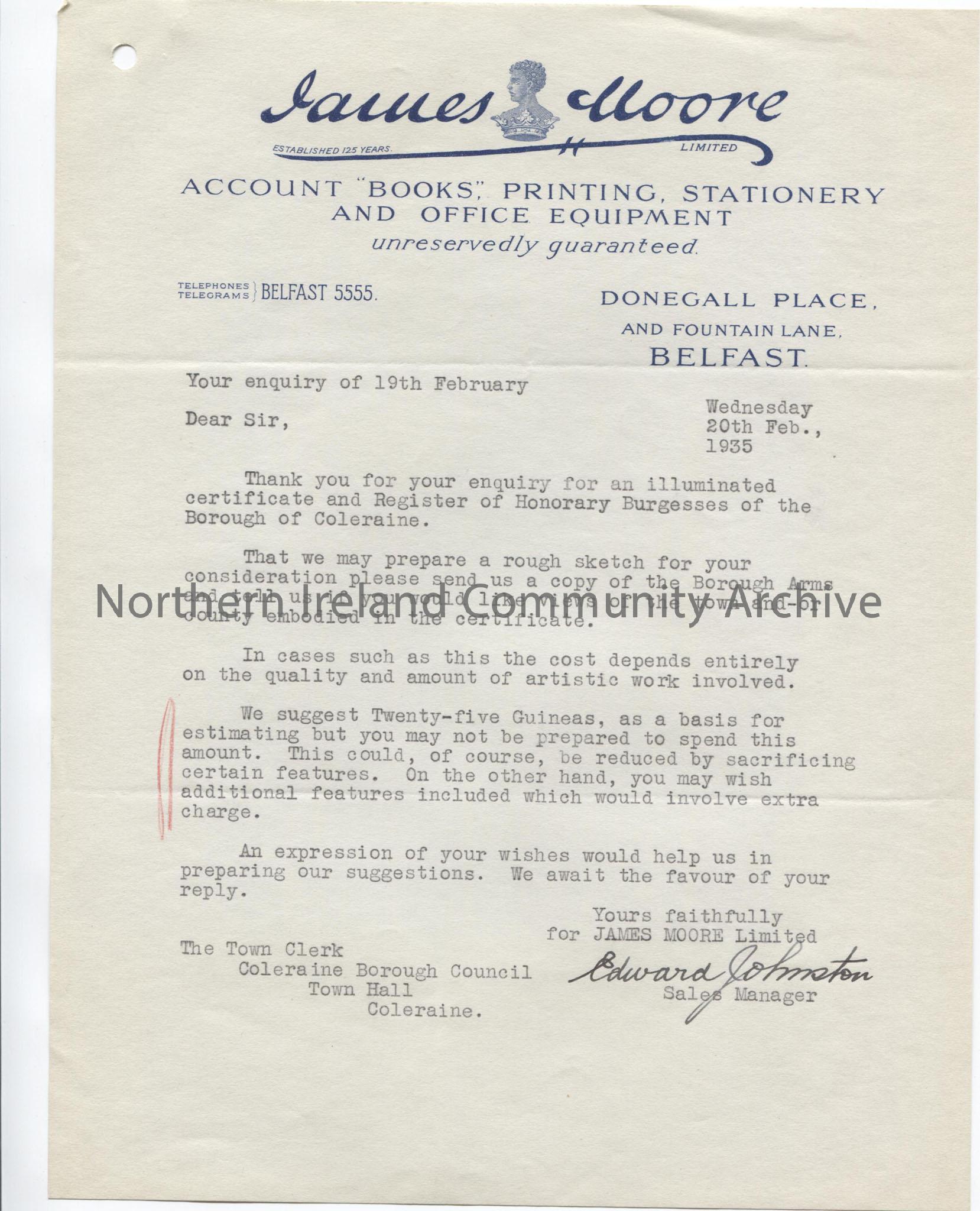 Letter to the Town Clerk, Coleraine Borough Council from Edward Johnston the Sales Manager of James Moore Limited. Re: Asking for a copy of the Borough Arms and giving an estimated cost for the illuminated certificate and Register of Honorary Burgesses.
